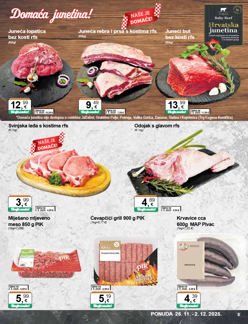 5 ponuda 26. 11. - 2. 12. 2025. domaća junetina! domaća junetina! *domaća junetina nije dostupna u centrima jalžabet, grubišno polje, petrinja, velika gorica, daruvar, slatina i koprivnica (trg eugena kumičića) cijena na 2. 5. 2025: 10,99 € cijena na 2. 5. 2025: 7,99 € cijena na 2. 5. 2025: 11,99 € cijena na 2. 5. 2025: 4,59 € cijena na 2. 5. 2025: 6,99 € cijena na 2. 5. 2025: 6,69 € cijena na 2. 5. 2025: 4,99 € cijena na 2. 5. 2025: 5,99 € juneći but bez kosti rfs (€/kg) juneća lopatica bez kosti rfs (€/kg) juneća rebra i prsa s kostima rfs (€/kg) 13 , 99 € birajte mudro! 12 , 99 € birajte mudro! 9 , 49 € birajte mudro! miješano mljeveno meso 850 g pik (1kg=7,05€) ćevapčići grill 900 g pik (1kg=5,77 €) krvavice cca 600g map pivac (1kg=7,32 €) birajte mudro! 5 , 99 € birajte mudro! 5 , 19 € birajte mudro! 4 , 39 € odojak s glavom rfs (€ / kg) birajte mudro! 4 , 89 € svinjska leđa s kostima rfs (€ / kg) birajte mudro! 3 , 99 €