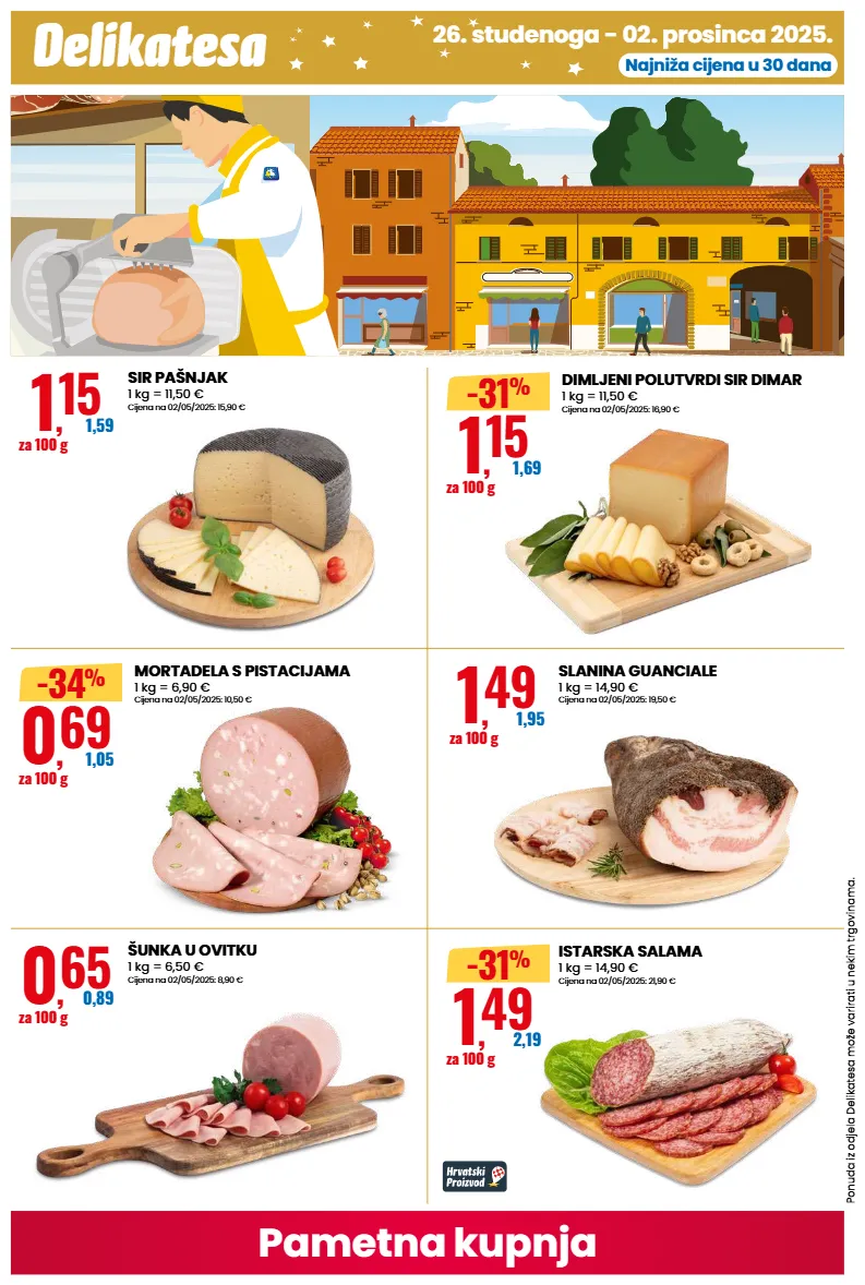 pametna kupnja delikatesa 26. studenoga - 02. prosinca 2025. najniža cijena u 30 dana ponuda iz odjela delikatesa može varirati u nekim trgovinama. sir pašnjak 1 kg = 11,50 € cijena na 02/05/2025: 15,90 € 1 , 15 1,59 za 100 g dimljeni polutvrdi sir dimar 1 kg = 11,50 € cijena na 02/05/2025: 16,90 € 1 , 15 1,69 za 100 g mortadela s pistacijama 1 kg = 6,90 € cijena na 02/05/2025: 10,50 € 0 , 69 1,05 za 100 g slanina guanciale 1 kg = 14,90 € cijena na 02/05/2025: 19,50 € 1 , 49 1,95 za 100 g šunka u ovitku 1 kg = 6,50 € cijena na 02/05/2025: 8,90 € 0 , 65 0,89 za 100 g istarska salama 1 kg = 14,90 € cijena na 02/05/2025: 21,90 € 1 , 49 2,19 za 100 g -31 % -34 % -31 %