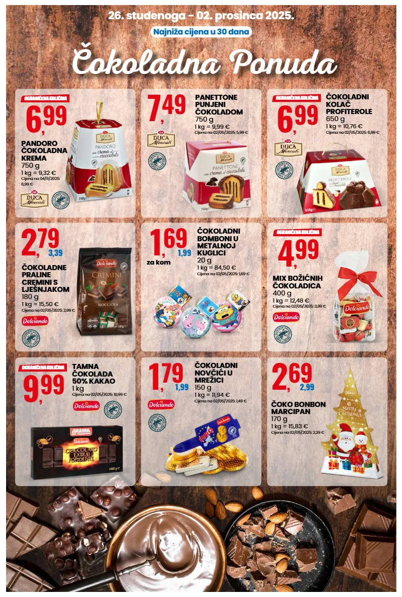 najniža cijena u 30 dana 26. studenoga - 02. prosinca 2025. 7 , 49 panettone punjeni čokoladom 750 g 1 kg = 9,99 € cijena na 02/05/2025: 5,99 € 1 , 69 1,99 za kom čokoladni bomboni u metalnoj kuglici 20 g 1 kg = 84,50 € cijena na 02/05/2025: 1,69 € 4 , 99 ograničena količina mix božićnih čokoladica 400 g 1 kg = 12,48 € cijena na 02/05/2025: 3,99 € 6 , 99 ograničena količina čokoladni kolač profiterole 650 g 1 kg = 10,76 € cijena na 02/05/2025: 6,99 € 6 , 99 ograničena količina pandoro čokoladna krema 750 g 1 kg = 9,32 € cijena na 04/11/2025: 6,99 € 1 , 79 1,99 čokoladni novčići u mrežici 150 g 1 kg = 11,94 € cijena na 02/05/2025: 1,49 € 2 , 69 2,99 čoko bonbon marcipan 170 g 1 kg = 15,83 € cijena na 02/05/2025: 2,39 € 2 , 79 3,39 čokoladne praline cremini s lješnjakom 180 g 1 kg = 15,50 € cijena na 02/05/2025: 2,99 € 9 , 99 ograničena količina tamna čokolada 50% kakao 1 kg cijena na 02/05/2025: 10,99 €