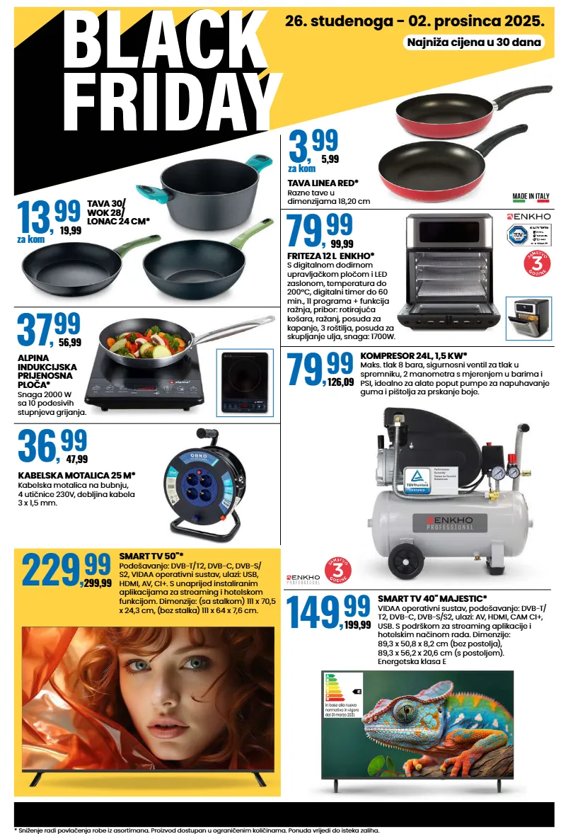 * sniženje radi povlačenja robe iz asortimana. proizvod dostupan u ograničenim količinama. ponuda vrijedi do isteka zaliha. 26. studenoga - 02. prosinca 2025. najniža cijena u 30 dana a b c d e f g e smart tv 40" majestic* vidaa operativni sustav, podešavanje: dvb-t/ t2, dvb-c, dvb-s/s2, ulazi: av, hdmi, cam ci+, usb. s podrškom za streaming aplikacije i hotelskim načinom rada. dimenzije: 89,3 x 50,8 x 8,2 cm (bez postolja), 89,3 x 56,2 x 20,6 cm (s postoljem). energetska klasa e 149 , 99 199,99 alpina indukcijska prijenosna ploča* snaga 2000 w sa 10 podesivih stupnjeva grijanja. 37 , 99 56,99 friteza 12 l enkho* s digitalnom dodirnom upravljačkom pločom i led zaslonom, temperatura do 200°c, digitalni timer do 60 min., 11 programa + funkcija ražnja, pribor: rotirajuća košara, ražanj, posuda za kapanje, 3 roštilja, posuda za skupljanje ulja, snaga: 1700w. 79 , 99 99,99 smart tv 50"* podešavanje: dvb-t/t2, dvb-c, dvb-s/ s2, vidaa operativni sustav, ulazi: usb, hdmi, av, ci+. s unaprijed instaliranim aplikacijama za streaming i hotelskom funkcijom. dimenzije: (sa stalkom) 111 x 70,5 x 24,3 cm, (bez stalka) 111 x 64 x 7,6 cm. 229 , 99 299,99 kompresor 24l, 1,5 kw* maks. tlak 8 bara, sigurnosni ventil za tlak u spremniku, 2 manometra s mjerenjem u barima i psi, idealno za alate poput pumpe za napuhavanje guma i pištolja za prskanje boje. 79 , 99 126,09 kabelska motalica 25 m* kabelska motalica na bubnju, 4 utičnice 230v, debljina kabela 3 x 1,5 mm. 36 , 99 47,99 tava 30/ wok 28/ lonac 24 cm* 13 , 99 19,99 za kom tava linea red* razne tave u dimenzijama 18,20 cm 3 , 99 5,99 za kom
