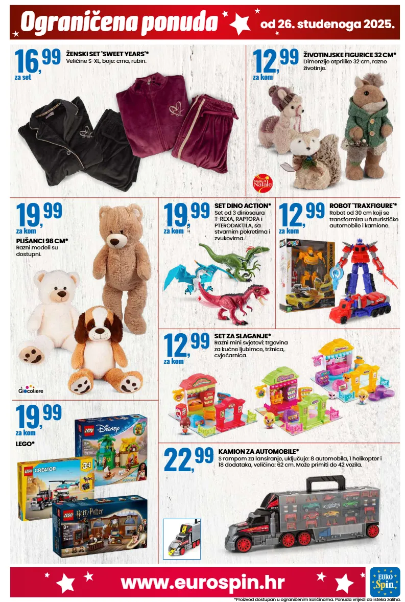 od 26. studenoga 2025. www.eurospin.hr ograničena ponuda *proizvod dostupan u ograničenim količinama. ponuda vrijedi do isteka zaliha. lego* 19 , 99 za kom kamion za automobile* s rampom za lansiranje, uključuje: 8 automobila, 1 helikopter i 18 dodataka, veličina: 62 cm. može primiti do 42 vozila. 22 , 99 životinjske figurice 32 cm* dimenzije otprilike 32 cm, razne životinje. 12 , 99 za kom set za slaganje* razni mini svjetovi: trgovina za kućne ljubimce, tržnica, cvjećarnica. 12 , 99 za kom plišanci 98 cm* razni modeli su dostupni. 19 , 99 za kom set dino action* set od 3 dinosaura t-rexa, raptora i pterodaktila, sa stvarnim pokretima i zvukovima. 19 , 99 za kom robot 'traxfigure'* robot od 30 cm koji se transformira u futurističke automobile i kamione. 12 , 99 za kom ženski set 'sweet years'* veličine s-xl, boje: crna, rubin. 16 , 99 za set