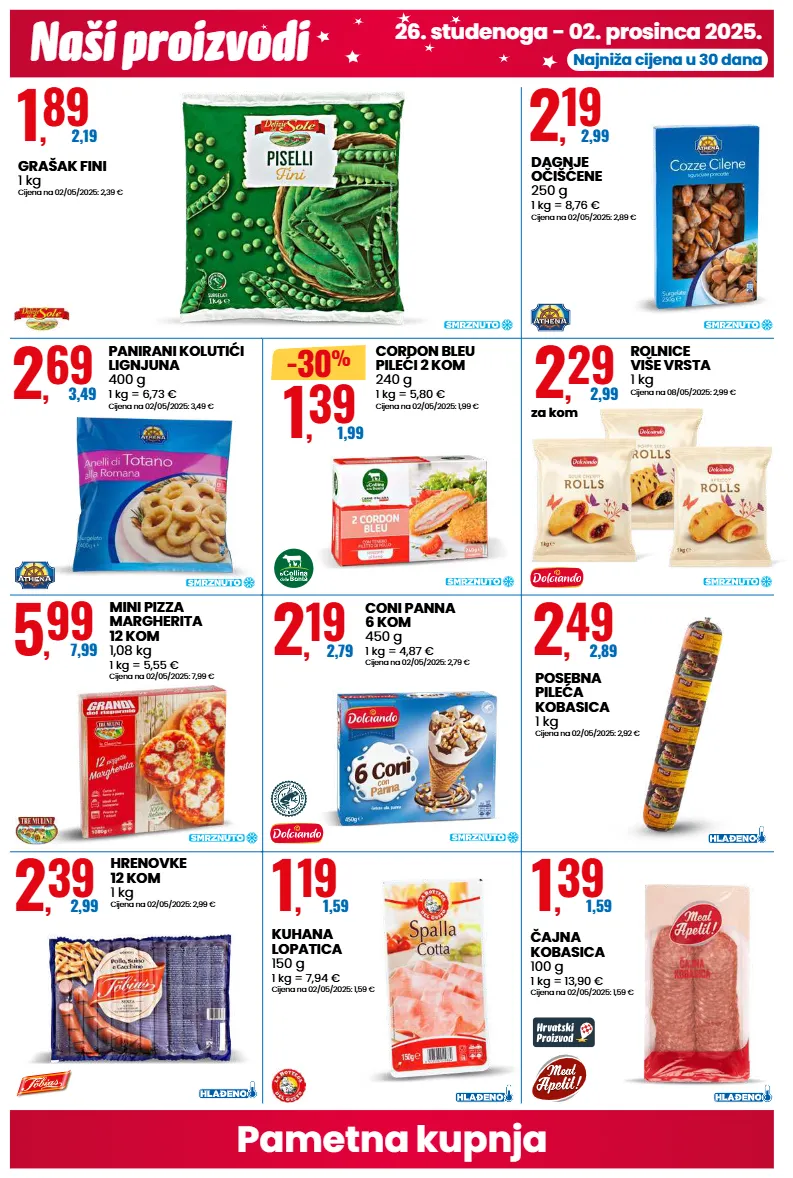 naši proizvodi pametna kupnja 26. studenoga - 02. prosinca 2025. najniža cijena u 30 dana 1 , 89 2,19 grašak fini 1 kg cijena na 02/05/2025: 2,39 € 2 , 19 2,99 dagnje očišćene 250 g 1 kg = 8,76 € cijena na 02/05/2025: 2,89 € 2 , 69 3,49 panirani kolutići lignjuna 400 g 1 kg = 6,73 € cijena na 02/05/2025: 3,49 € 1 , 39 1,99 -30 % cordon bleu pileći 2 kom 240 g 1 kg = 5,80 € cijena na 02/05/2025: 1,99 € 2 , 29 2,99 za kom rolnice više vrsta 1 kg cijena na 08/05/2025: 2,99 € 5 , 99 7,99 mini pizza margherita 12 kom 1,08 kg 1 kg = 5,55 € cijena na 02/05/2025: 7,99 € 2 , 19 2,79 coni panna 6 kom 450 g 1 kg = 4,87 € cijena na 02/05/2025: 2,79 € 2 , 49 2,89 posebna pileća kobasica 1 kg cijena na 02/05/2025: 2,92 € 2 , 39 2,99 hrenovke 12 kom 1 kg cijena na 02/05/2025: 2,99 € 1 , 19 1,59 kuhana lopatica 150 g 1 kg = 7,94 € cijena na 02/05/2025: 1,59 € 1 , 39 1,59 čajna kobasica 100 g 1 kg = 13,90 € cijena na 02/05/2025: 1,59 €