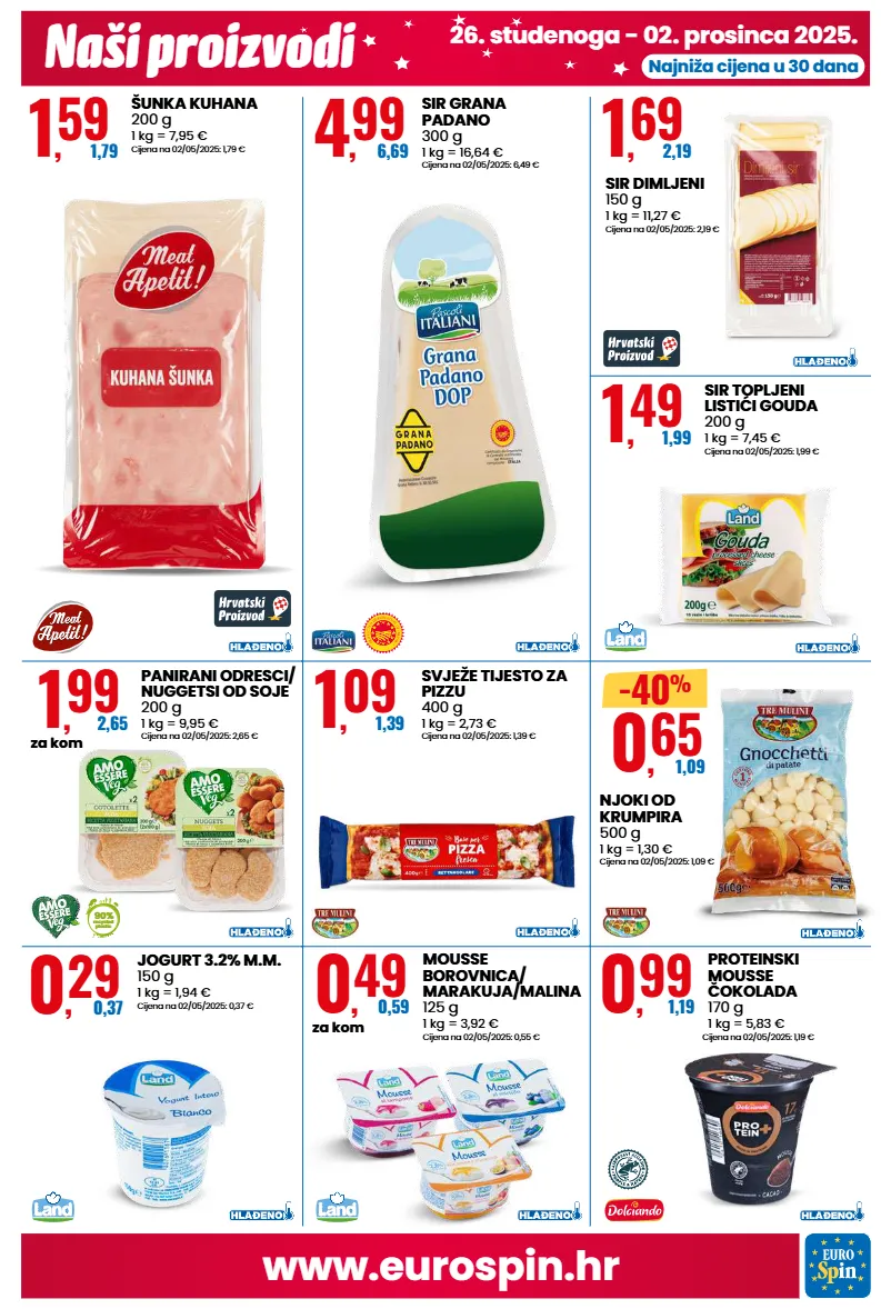 www.eurospin.hr naši proizvodi 26. studenoga - 02. prosinca 2025. najniža cijena u 30 dana 0 , 49 0,59 za kom mousse borovnica/ marakuja/malina 125 g 1 kg = 3,92 € cijena na 02/05/2025: 0,55 € 1 , 59 1,79 šunka kuhana 200 g 1 kg = 7,95 € cijena na 02/05/2025: 1,79 € 4 , 99 6,69 • p r o t e c t e d d e s i g n a t i o n o f o r i g i n • sir grana padano 300 g 1 kg = 16,64 € cijena na 02/05/2025: 6,49 € 1 , 69 2,19 sir dimljeni 150 g 1 kg = 11,27 € cijena na 02/05/2025: 2,19 € 1 , 49 1,99 sir topljeni listići gouda 200 g 1 kg = 7,45 € cijena na 02/05/2025: 1,99 € 1 , 99 2,65 za kom 90% recycled plastic panirani odresci/ nuggetsi od soje 200 g 1 kg = 9,95 € cijena na 02/05/2025: 2,65 € 1 , 09 1,39 svježe tijesto za pizzu 400 g 1 kg = 2,73 € cijena na 02/05/2025: 1,39 € 0 , 65 1,09 -40 % njoki od krumpira 500 g 1 kg = 1,30 € cijena na 02/05/2025: 1,09 € 0 , 29 0,37 jogurt 3.2% m.m. 150 g 1 kg = 1,94 € cijena na 02/05/2025: 0,37 € 0 , 99 1,19 proteinski mousse čokolada 170 g 1 kg = 5,83 € cijena na 02/05/2025: 1,19 €