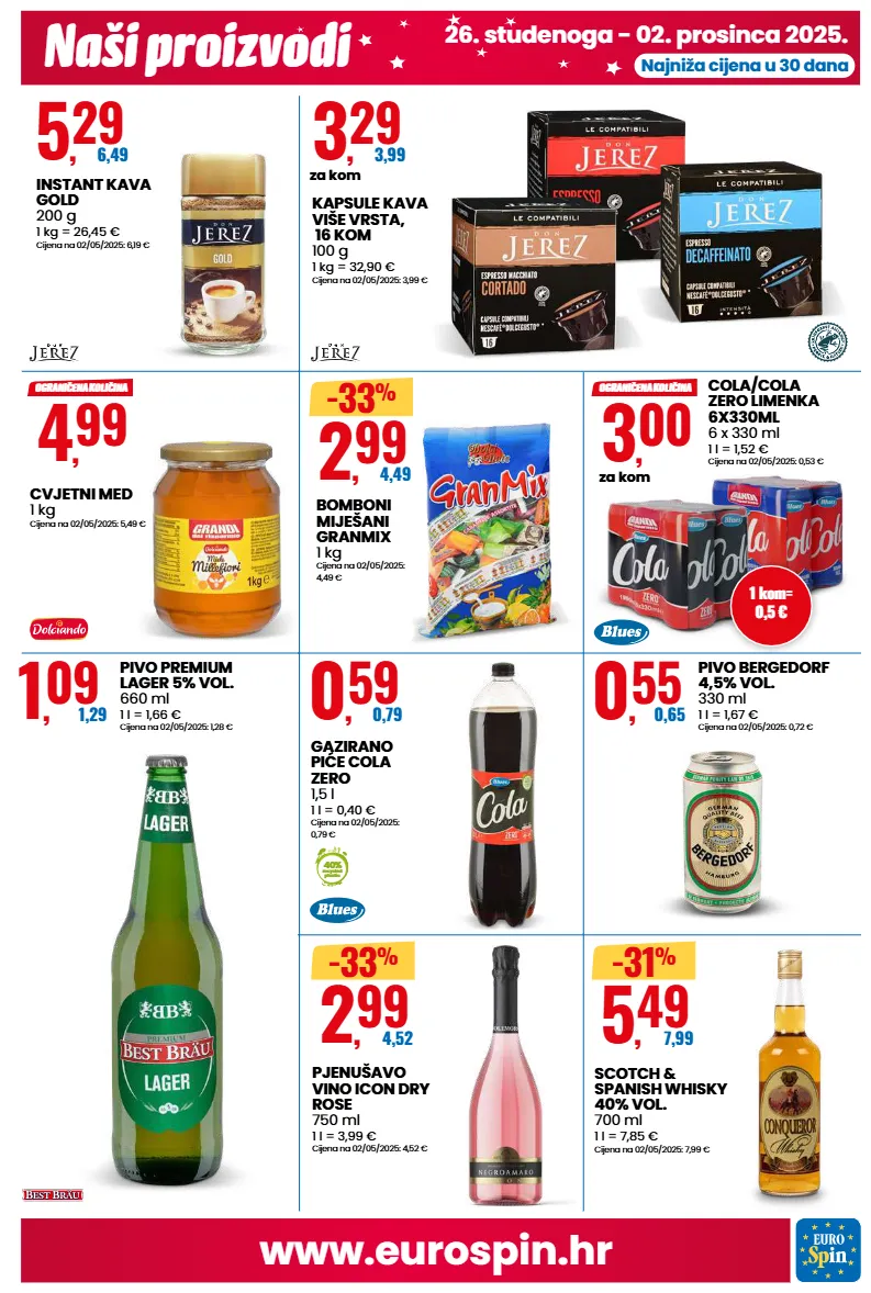 26. studenoga - 02. prosinca 2025. www.eurospin.hr naši proizvodi najniža cijena u 30 dana 2 , 99 4,49 -33 % bomboni miješani granmix 1 kg cijena na 02/05/2025: 4,49 € 0 , 59 0,79 40% recycled plastic gazirano piće cola zero 1,5 l 1 l = 0,40 € cijena na 02/05/2025: 0,79 € 0 , 55 0,65 pivo bergedorf 4,5% vol. 330 ml 1 l = 1,67 € cijena na 02/05/2025: 0,72 € 1 , 09 1,29 pivo premium lager 5% vol. 660 ml 1 l = 1,66 € cijena na 02/05/2025: 1,28 € 2 , 99 4,52 -33 % pjenušavo vino icon dry rose 750 ml 1 l = 3,99 € cijena na 02/05/2025: 4,52 € 5 , 49 7,99 -31 % scotch & spanish whisky 40% vol. 700 ml 1 l = 7,85 € cijena na 02/05/2025: 7,99 € 3 , 00 za kom ograničena količina cola/cola zero limenka 6x330ml 6 x 330 ml 1 l = 1,52 € cijena na 02/05/2025: 0,53 € 1 kom= 0,5 € 5 , 29 6,49 instant kava gold 200 g 1 kg = 26,45 € cijena na 02/05/2025: 6,19 € 3 , 29 3,99 za kom kapsule kava više vrsta, 16 kom 100 g 1 kg = 32,90 € cijena na 02/05/2025: 3,99 € 4 , 99 ograničena količina cvjetni med 1 kg cijena na 02/05/2025: 5,49 €