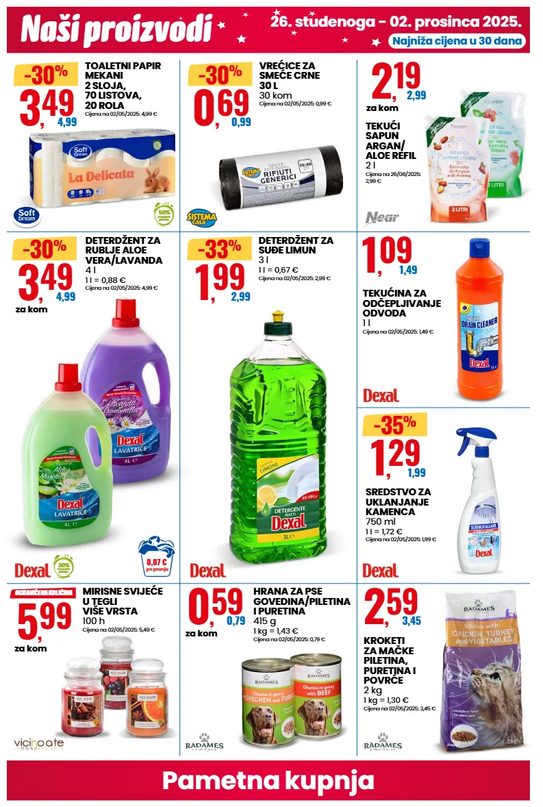 naši proizvodi pametna kupnja 26. studenoga - 02. prosinca 2025. najniža cijena u 30 dana 3 , 49 4,99 50% recycled plastic -30 % toaletni papir mekani 2 sloja, 70 listova, 20 rola cijena na 02/05/2025: 4,99 € 0 , 69 0,99 -30 % vrećice za smeće crne 30 l 30 kom cijena na 02/05/2025: 0,99 € 2 , 19 2,99 za kom tekući sapun argan/ aloe refil 2 l cijena na 26/08/2025: 2,99 € 3 , 49 4,99 za kom 30% recycled plastic po pranju -30 % deterdžent za rublje aloe vera/lavanda 4 l 1 l = 0,88 € cijena na 02/05/2025: 4,99 € 1 , 99 2,99 -33 % deterdžent za suðe limun 3 l 1 l = 0,67 € cijena na 02/05/2025: 2,99 € 1 , 09 1,49 tekućina za odčepljivanje odvoda 1 l cijena na 02/05/2025: 1,49 € 1 , 29 1,99 -35 % sredstvo za uklanjanje kamenca 750 ml 1 l = 1,72 € cijena na 02/05/2025: 1,99 € 5 , 99 za kom ograničena količina mirisne svijeće u tegli više vrsta 100 h cijena na 02/05/2025: 5,49 € 0 , 59 0,79 za kom hrana za pse govedina/piletina i puretina 415 g 1 kg = 1,43 € cijena na 02/05/2025: 0,79 € 2 , 59 3,45 kroketi za mačke piletina, puretina i povrće 2 kg 1 kg = 1,30 € cijena na 02/05/2025: 3,45 € 0,07 €