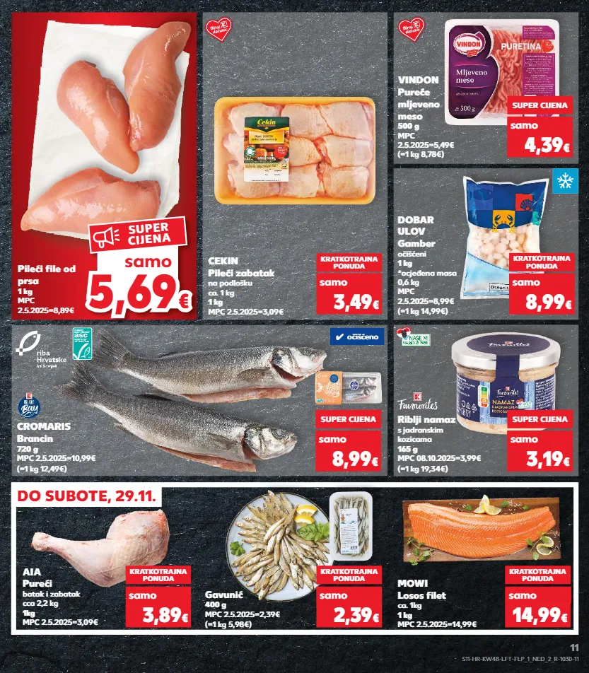 super cijena super cijena kratkotrajna ponuda kratkotrajna ponuda kratkotrajna ponuda 5,6 9 5,69 € € samo super cijena do subote, 29.11. cromaris brancin 720 g mpc 2.5.2025=10,99€ (=1 kg 12,49€) dobar ulov gamber očišćeni 1 kg *ocjeđena masa 0,6 kg mpc 2.5.2025=8,99€ (=1 kg 14,99€) riblji namaz s jadranskim kozicama 165 g mpc 08.10.2025=3,99€ (=1 kg 19,34€) super cijena 8,99 € kratkotrajna ponuda 8,99 € super cijena 3,19 € aia pureći batak i zabatak cca 2,2 kg 1kg mpc 2.5.2025=3,09€ gavunić 400 g mpc 2.5.2025=2,39€ (=1 kg 5,98€) mowi losos filet ca. 1kg 1 kg mpc 2.5.2025=14,99€ kratkotrajna ponuda samo 3,89 € kratkotrajna ponuda 2,39 € kratkotrajna ponuda 14,99 € cekin pileći zabatak na podlošku ca. 1 kg 1 kg mpc 2.5.2025=3,09€ kratkotrajna ponuda samo 3,49 € pileći file od prsa 1 kg mpc 2.5.2025=8,89€ (=1 kg 8,78€) vindon pureće mljeveno meso 500 g mpc 2.5.2025=5,49€ super cijena 4,39 € samo samo samo samo samo samo ✓ očišćeno s11-hr-kw48-lft-flp_1_ned_2_r-1030-11 11