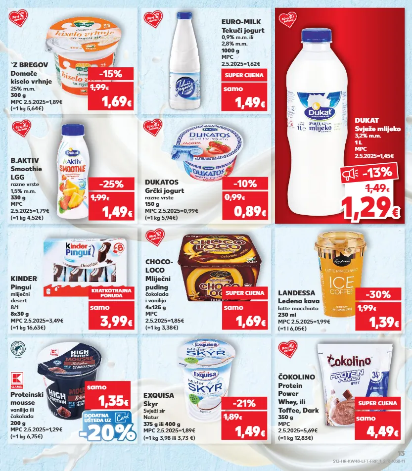 kratkotrajna ponuda kratkotrajna ponuda kratkotrajna ponuda kratkotrajna ponuda kratkotrajna ponuda kratkotrajna ponuda kratkotrajna ponuda kratkotrajna ponuda landessa ledena kava latte macchiato 230 ml mpc 2.5.2025=1,99€ (=1 l 6,05€) -30% 1,39 € 1,99 € dukatos grčki jogurt razne vrste 150 g mpc 2.5.2025=0,99€ (=1 kg 5,94€) choco- loco mliječni puding čokolada i vanilija 4x125 g mpc 2.5.2025=1,85€ (=1 kg 3,38€) -10% 0,89 € 0,99 € kinder pingui mliječni desert 8/1 8x30 g mpc 2.5.2025=3,49€ (=1 kg 16,63€) kratkotrajna ponuda 3,99 € super cijena 1,69 € b.aktiv smoothie lgg razne vrste 1,5% m.m. 330 g mpc 2.5.2025=1,79€ (=1 kg 4,52€) -25% 1,49 € 1,99 € exquisa skyr svježi sir natur 375 g ili 400 g mpc 2.5.2025=1,89€ (=1 kg 3,98 ili 3,73 €) čokolino protein power whey, ili toffee, dark 350 g mpc 2.5.2025=5,69€ (=1 kg 12,83€) -21% 1,49 € 1,89 € super cijena 4,49 € euro-milk tekući jogurt 0,9% m.m. ili 2,8% m.m. 1000 g mpc 2.5.2025=1,62€ samo super cijena 1,49 € (=1 kg 5,64€) `z bregov domaće kiselo vrhnje 25% m.m. 300 g mpc 2.5.2025=1,89€ -15% 1,69 € 1,99 € dukat svježe mlijeko 3,2% m.m. 1 l mpc 2.5.2025=1,45€ (=1 kg 6,75€) proteinski mousse vanilija ili čokolada 200 g mpc 2.5.2025=1,29€ samo 1,35 € - - 20 % 20 % dodatna ušteda uz samo samo samo 1,29 1,29 € € -13 % 1,49 € s13-hr-kw48-lft-frp_1_2_r-1030-11 13