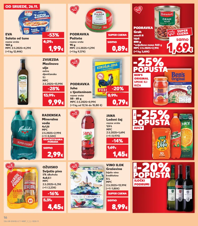 kratkotrajna ponuda kratkotrajna ponuda kratkotrajna ponuda kratkotrajna ponuda kratkotrajna ponuda kratkotrajna ponuda kratkotrajna ponuda 1,6 9 1,69 € € samo super cijena od srijede, 26.11. eva salata od tune razne vrste 160 g mpc 2.5.2025=4,29€ (=1 kg 12,44€) podravka pašteta razne vrste 95 g mpc 2.5.2025=1,29€ (=1 kg 9,37€) podravka grah smeđi ili bijeli 800 g *ocijeđena masa 460 g mpc 2.5.2025=2,19€ (=1 kg 3,68€) zvijezda maslinovo ulje extra djevičansko 1 l mpc 2.5.2025=13,99€ podravka juha s tjesteninom razne vrste 50 - 65 g mpc 2.5.2025=0,99€ (=1 kg od 12,16 do 15,80 €) -53% 1,99 € 4,29 € super cijena 0,89 € -28% 9,99 € 13,99 € -20% 0,79 € 0,99 € ben‘s original umak ili riža -25% popusta vino ilok graševina bijelo vino kvalitetno 5 l mpc 2.5.2025=13,99€ (=1 l 1,80€) ožujsko svijetlo pivo 5% alkohola 4x0,5 l mpc 2.5.2025=5,31€ (=1 l 2,23€) -16% 4,45 € 5,31 € samo super cijena 8,99 € kratkotrajna ponuda 2,99 € (=1 l 0,50€) radenska mineralna voda 4x1,5l mpc 2.5.2025=2,99€ -14% 1,45 € 1,69 € (=1 l 0,97€) jana ledeni čaj razne vrste 1,5 l mpc 2.5.2025=1,69€ -20% popusta do -25% popusta do juicy iločki podrumi samo samo s16-hr-kw48-lft-nmp_1_1_l-1030-11 16