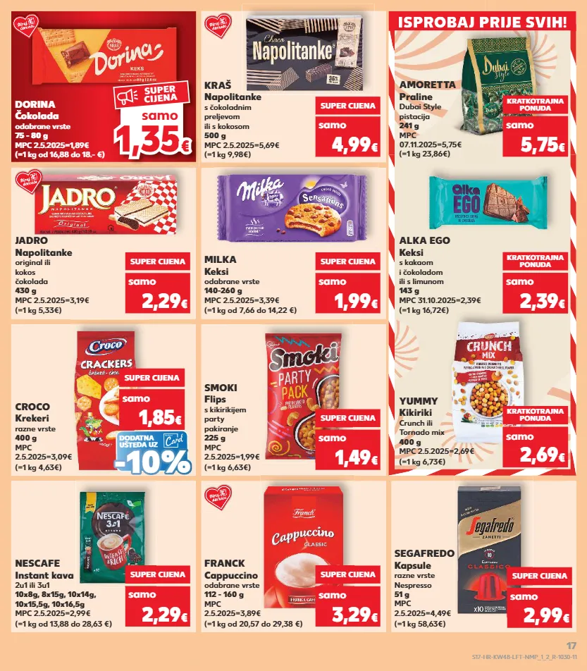 3,29 € kratkotrajna ponuda kratkotrajna ponuda kratkotrajna ponuda kratkotrajna ponuda kratkotrajna ponuda kratkotrajna ponuda kratkotrajna ponuda kratkotrajna ponuda isprobaj prije svih! isprobaj prije svih! 1,3 5 1,35 € € samo super cijena jadro napolitanke original ili kokos čokolada 430 g mpc 2.5.2025=3,19€ (=1 kg 5,33€) alka ego keksi s kakaom i čokoladom ili s limunom 143 g mpc 31.10.2025=2,39€ (=1 kg 16,72€) samo super cijena 2,29 € milka keksi odabrane vrste 140-260 g mpc 2.5.2025=3,39€ (=1 kg od 7,66 do 14,22 €) super cijena 1,99 € kratkotrajna ponuda 2,39 € croco krekeri razne vrste 400 g mpc 2.5.2025=3,09€ (=1 kg 4,63€) smoki flips s kikirikijem party pakiranje 225 g mpc 2.5.2025=1,99€ (=1 kg 6,63€) yummy kikiriki crunch ili tornado mix 400 g mpc 2.5.2025=2,69€ (=1 kg 6,73€) super cijena 1,85 € samo super cijena 1,49 € kratkotrajna ponuda 2,69 € nescafe instant kava 2u1 ili 3u1 10x8g, 8x15g, 10x14g, 10x15,5g, 10x16,5g mpc 2.5.2025=2,99€ (=1 kg od 13,88 do 28,63 €) franck cappuccino odabrane vrste 112 - 160 g mpc 2.5.2025=3,89€ (=1 kg od 20,57 do 29,38 €) samo super cijena 2,29 € super cijena 3,29 € (=1 kg 9,98€) kraš napolitanke s čokoladnim preljevom ili s kokosom 500 g mpc 2.5.2025=5,69€ super cijena 4,99 € (=1 kg od 16,88 do 18.- €) dorina čokolada odabrane vrste 75 - 80 g mpc 2.5.2025=1,89€ (=1 kg 23,86€) amoretta praline dubai style pistacija 241 g mpc 07.11.2025=5,75€ kratkotrajna ponuda 5,75 € (=1 kg 58,63€) segafredo kapsule razne vrste nespresso 51 g mpc 2.5.2025=4,49€ super cijena samo 2,99 € dodatna ušteda uz - - 10% 10% samo samo samo samo samo samo samo s17-hr-kw48-lft-nmp_1_2_r-1030-11 17