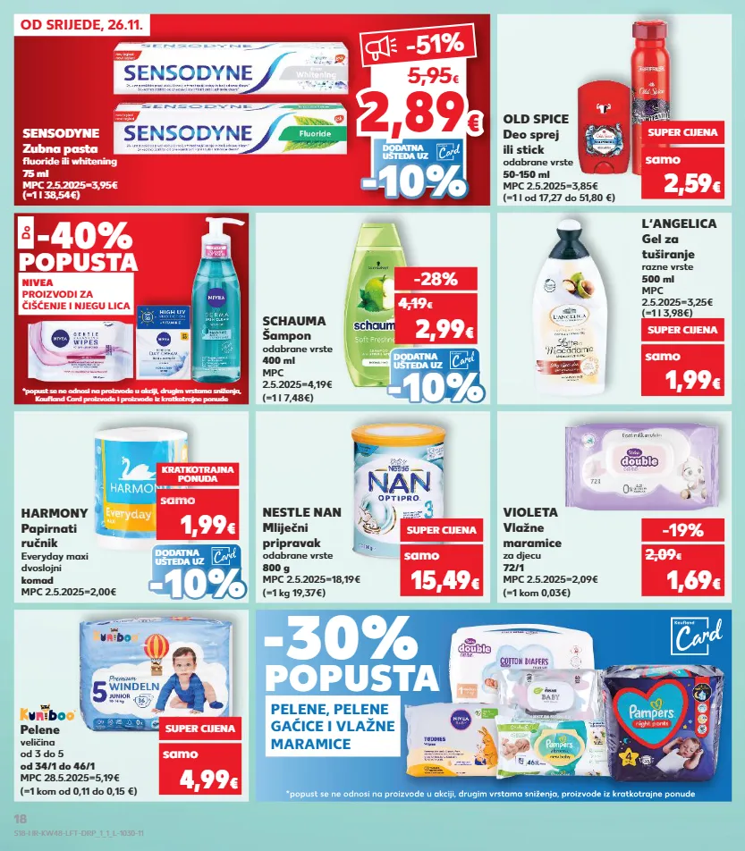 kratkotrajna ponuda kratkotrajna ponuda kratkotrajna ponuda kratkotrajna ponuda kratkotrajna ponuda kratkotrajna ponuda samo nivea proizvodi za čišćenje i njegu lica od srijede, 26.11. *popust se ne odnosi na proizvode u akciji, drugim vrstama sniženja, proizvode iz kratkotrajne ponude -30% popusta pelene, pelene gaćice i vlažne maramice popusta *popust se ne odnosi na proizvode u akciji, drugim vrstama sniženja, proizvode iz kratkotrajne ponude *popust se ne odnosi na proizvode u akciji, drugim vrstama sniženja, proizvode iz kratkotrajne ponude *popust se ne odnosi na proizvode u akciji, drugim vrstama sniženja, proizvode iz kratkotrajne ponude *popust se ne odnosi na proizvode u akciji, drugim vrstama sniženja, proizvode iz kratkotrajne ponude *popust se ne odnosi na proizvode u akciji, drugim vrstama sniženja, proizvode iz kratkotrajne ponude nestle nan mliječni pripravak odabrane vrste 800 g mpc 2.5.2025=18,19€ (=1 kg 19,37€) violeta vlažne maramice za djecu 72/1 mpc 2.5.2025=2,09€ (=1 kom 0,03€) pelene veličina od 3 do 5 od 34/1 do 46/1 mpc 28.5.2025=5,19€ (=1 kom od 0,11 do 0,15 €) samo super cijena 15,49 € samo super cijena 4,99 € -19% 1,69 € 2,09 € samo super cijena 2,59 € (=1 l od 17,27 do 51,80 €) old spice deo sprej ili stick odabrane vrste 50-150 ml mpc 2.5.2025=3,85€ samo super cijena 1,99 € (=1 l 3,98€) l‘angelica gel za tuširanje razne vrste 500 ml mpc 2.5.2025=3,25€ -40% popusta do dodatna ušteda uz (=1 l 7,48€) schauma šampon odabrane vrste 400 ml mpc 2.5.2025=4,19€ -28% 2,99 € 4,19 € - - 10% 10% dodatna ušteda uz harmony papirnati ručnik everyday maxi dvoslojni komad mpc 2.5.2025=2,00€ kratkotrajna ponuda samo 1,99 € sa o 1,99 samo 1,99 sam 1,99 samo 1,99 sam samo o € o - - 10% 10% (=1 l 38,54€) sensodyne zubna pasta fluoride ili whitening 75 ml mpc 2.5.2025=3,95€ *popust se ne odnosi na proizvode u akciji, drugim vrstama sniženja, kaufland card proizvode i proizvode iz kratkotrajne ponude -51 % 5,95 € dodatna ušteda uz - - 10% 10% 2,8 9 2,89 € € s18-hr-kw48-lft-drp_1_1_l-1030-11 18