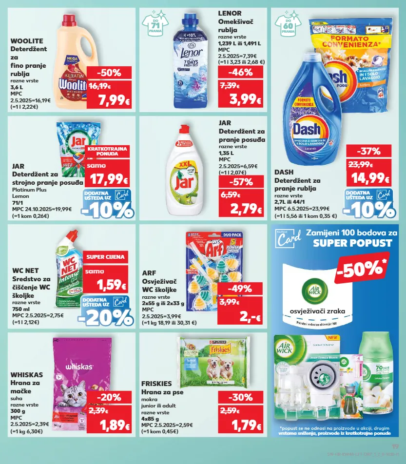 kratkotrajna ponuda kratkotrajna ponuda kratkotrajna ponuda kratkotrajna ponuda kratkotrajna ponuda kratkotrajna ponuda samo kratkotrajna ponuda samo kratkotrajna ponuda whiskas hrana za mačke suha razne vrste 300 g mpc 2.5.2025=2,39€ (=1 kg 6,30€) friskies hrana za pse mokra junior ili adult razne vrste 4x85 g mpc 2.5.2025=2,59€ (=1 kom 0,45€) -20% 1,89 € 2,39 € -30% 1,79 € 2,59 € (=1 l 2,07€) jar deterdžent za pranje posuđa razne vrste 1,35 l mpc 2.5.2025=6,59€ -57% 2,79 € 6,59 € (=1 l 2,22€) woolite deterdžent za fino pranje rublja razne vrste 3,6 l mpc 2.5.2025=16,19€ -50% 7,99 € 16,19 € (=1 kg 18,19 ili 30,31 €) arf osvježivač wc školjke razne vrste 2x55 g ili 2x33 g mpc 2.5.2025=3,99€ -49% 2,- € 3,99 € dodatna ušteda uz (=1 l 3,23 ili 2,68 €) lenor omekšivač rublja razne vrste 1,239 l ili 1,491 l mpc 2.5.2025=7,39€ -46% 3,99 € 7,39 € (=1 l 5,56 ili 1 kom 0,35 €) dash deterdžent za pranje rublja razne vrste 2,7l ili 44/1 mpc 6.5.2025=23,99€ -37% 14,99 € 23,99 € - - 10% 10% dodatna ušteda uz (=1 kom 0,26€) jar deterdžent za strojno pranje posuđa platinum plus lemon 71/1 mpc 24.10.2025=19,99€ kratkotrajna ponuda samo 17,99 € sa 17,99 samo 17,99 samo 17,99 samo 17,99 samo samo € - - 10% 10% dodatna ušteda uz (=1 l 2,12€) wc net sredstvo za čišćenje wc školjke razne vrste 750 ml mpc 2.5.2025=2,75€ super cijena samo 1,59 € sa o 1,59 sam 1,59 sam 1,5 sam 1,59 sam sam o € o - - 20 % 20 % zamijeni 100 bodova za super popust -50% * *popust se ne odnosi na proizvode u akciji, drugim vrstama sniženja, proizvode iz kratkotrajne ponude osvježivači zraka *popust se ne odnosi na proizvode u akciji, drugim 71 pranja do 60 pranja do *popust se ne odnosi na proizvode u akciji, drugim *popust se ne odnosi na proizvode u akciji, drugim s19-hr-kw48-lft-drp_1_2_r-1030-11 19