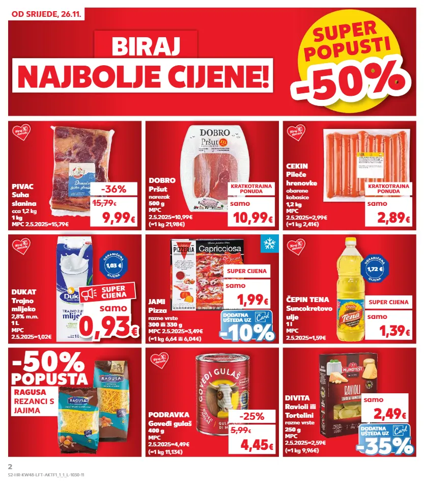 -33% 2,99 € samo kratkotrajna ponuda samo samo kratkotrajna ponuda samo kratkotrajna ponuda samo kratkotrajna ponuda od srijede, 26.11. biraj biraj najbolje cijene! super popusti popusti -50% -50% 0,9 3 0,93 € € samo super cijena dobro pršut narezak 500 g mpc 2.5.2025=10,99€ (=1 kg 21,98€) cekin pileće hrenovke obarene kobasice 1,2 kg mpc 2.5.2025=2,99€ (=1 kg 2,41€) dukat trajno mlijeko 2,8% m.m. 1 l mpc 2.5.2025=1,02€ čepin tena suncokretovo ulje 1 l mpc 2.5.2025=1,59€ podravka goveđi gulaš 400 g mpc 2.5.2025=4,49€ (=1 kg 11,13€) kratkotrajna ponuda 10,99 € pivac suha slanina cca 1,2 kg 1 kg mpc 2.5.2025=15,79€ -36% 9,99 € 15,79 € kratkotrajna ponuda 2,89 € -25% 4,45 € 5,99 € super cijena 1,39 € -50 % popusta ragusa rezanci s jajima (=1 kg 9,96€) divita ravioli ili tortelini razne vrste 250 g mpc 2.5.2025=2,59€ samo 2,49 € - - 35 % 35 % dodatna ušteda uz 1,72 € 1,03 € dodatna ušteda uz (=1 kg 6,64 ili 6,04€) jami pizza razne vrste 300 ili 330 g mpc 2.5.2025=3,49€ samo 1,99 € - - 10% 10% samo samo samo super cijena s2-hr-kw48-lft-aktf1_1_1_l-1030-11 2