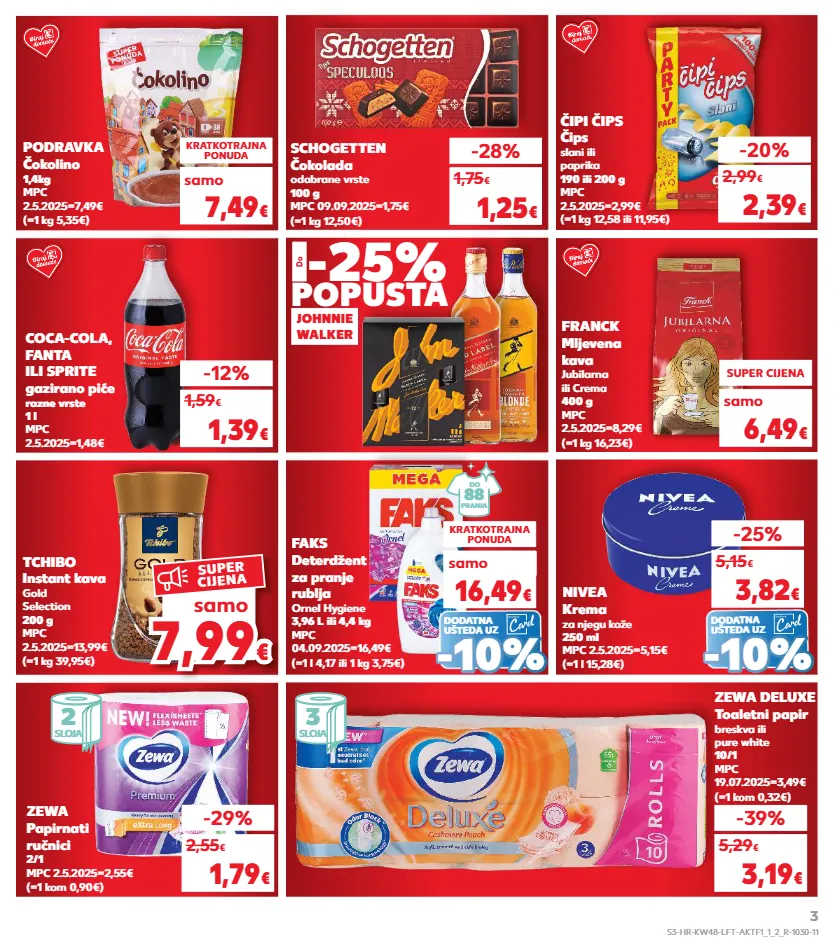 samo kratkotrajna ponuda samo kratkotrajna ponuda samo kratkotrajna ponuda samo samo kratkotrajna ponuda samo kratkotrajna ponuda samo kratkotrajna ponuda samo kratkotrajna ponuda samo samo 7,99 7,99 € € samo super cijena tchibo instant kava gold selection 200 g mpc 2.5.2025=13,99€ (=1 kg 39,95€) franck mljevena kava jubilarna ili crema 400 g mpc 2.5.2025=8,29€ (=1 kg 16,23€) super cijena 6,49 € zewa deluxe toaletni papir breskva ili pure white 10/1 mpc 19.07.2025=3,49€ (=1 kom 0,32€) -39% 3,19 € 5,29 € faks deterdžent za pranje rublja ornel hygiene 3,96 l ili 4,4 kg mpc 04.09.2025=16,49€ (=1 l 4,17 ili 1 kg 3,75€) zewa papirnati ručnici 2/1 mpc 2.5.2025=2,55€ (=1 kom 0,90€) schogetten čokolada odabrane vrste 100 g mpc 09.09.2025=1,75€ (=1 kg 12,50€) -28% 1,25 € 1,75 € kratkotrajna ponuda 16,49 € -29% 1,79 € 2,55 € (=1 kg 12,58 ili 11,95€) čipi čips čips slani ili paprika 190 ili 200 g mpc 2.5.2025=2,99€ -20% 2,39 € 2,99 € (=1 l 15,28€) nivea krema za njegu kože 250 ml mpc 2.5.2025=5,15€ -25% 3,82 € 5,15 € coca-cola, fanta ili sprite gazirano piće razne vrste 1 l mpc 2.5.2025=1,48€ -12% 1,39 € 1,59 € -25% popusta do johnnie walker 88 pranja do podravka čokolino 1,4kg mpc 2.5.2025=7,49€ (=1 kg 5,35€) kratkotrajna ponuda 7,49 € samo samo samo - - 10% 10% dodatna ušteda uz - - 10% 10% dodatna ušteda uz 2 sloja 3 sloja s3-hr-kw48-lft-aktf1_1_2_r-1030-11 3