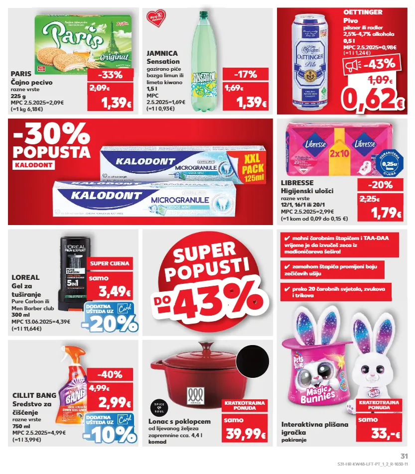 3,49 € samo samo kratkotrajna ponuda samo kratkotrajna ponuda samo kratkotrajna ponuda kratkotrajna ponuda kratkotrajna ponuda samo samo kalodont -30% popusta super popusti popusti -4 3% -43% do lonac s poklopcem od lijevanog željeza zapremnine cca. 4,4 l komad kratkotrajna ponuda 39,99 € samo interaktivna plišana igračka pakiranje kratkotrajna ponuda kratkotrajna ponuda super cijena kratkotrajna super cijena kratkotrajna ponuda super cijena onuda 33,- € samo (=1 kg 6,18€) paris čajno pecivo razne vrste 225 g mpc 2.5.2025=2,09€ -33% 1,39 € 2,09 € (=1 l 1,24€) oettinger pivo pilsner ili radler 2,5%-4,7% alkohola 0,5 l mpc 2.5.2025=0,98€ (=1 l 0,93€) jamnica sensation gazirano piće bazga limun ili limeta kiwano 1,5 l mpc 2.5.2025=1,69€ -17% 1,39 € 1,69 € 3,49 dodatna ušteda uz dodatna ušteda uz (=1 kom od 0,09 do 0,15 €) libresse higijenski ulošci razne vrste 12/1, 16/1 ili 20/1 mpc 2.5.2025=2,99€ (=1 l 11,64€) loreal gel za tuširanje pure carbon ili men barber club 300 ml mpc 13.06.2025=4,39€ (=1 l 3,99€) cillit bang sredstvo za čišćenje razne vrste 750 ml mpc 2.5.2025=4,99€ super cijena -20% -40% samo 3,49 € 1,79 € 2,25 € 2,99 € 4,99 € - - 20 % 20 % - - 10% 10% 0,25 €/ kom ✓ mahni čarobnim štapićem i taa-daa vrijeme je da izvučeš zeca iz mađioničareva šešira! ✓ zamahom štapića promijeni boju zečićevih ušiju ✓ preko 20 čarobnih svjetala, zvukova i trikova (=1 l 1,24€) 0,6 2 0,62 € € -43 % 1,09 € s31-hr-kw48-lft-pt_1_2_r-1030-11 31