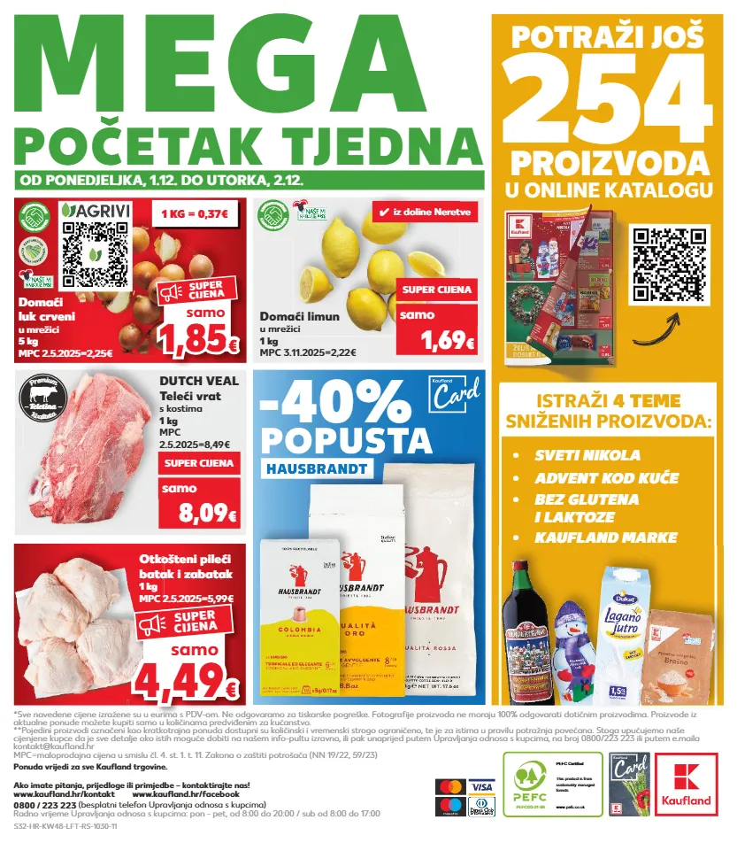kratkotrajna ponuda samo kratkotrajna ponuda samo 4,4 9 4,49 € € samo super cijena k v a l i t e t a p r e m i u m teletina pefc/23-31-86 pefc certified this product is from sustainably managed forests www.pefc.co.uk 254 u online katalogu potraži još proizvoda istraži 4 teme sniženih proizvoda: početak tjedna mega *sve navedene cijene izražene su u eurima s pdv-om. ne odgovaramo za tiskarske pogreške. fotografije proizvoda ne moraju 100% odgovarati dotičnim proizvodima. proizvode iz aktualne ponude možete kupiti samo u količinama predviđenim za kućanstvo. **pojedini proizvodi označeni kao kratkotrajna ponuda dostupni su količinski i vremenski strogo ograničeno, te je za istima u pravilu potražnja povećana. stoga upućujemo naše cijenjene kupce da je sve detalje oko istih moguće dobiti na našem info-pultu izravno, ili pak unaprijed putem upravljanja odnosa s kupcima, na broj 0800/223 223 ili putem e.maila kontakt@kaufland.hr mpc=maloprodajna cijena u smislu čl. 4. st. 1. t. 11. zakona o zaštiti potrošača (nn 19/22, 59/23) 0800 / 223 223 (besplatni telefon upravljanja odnosa s kupcima) radno vrijeme upravljanja odnosa s kupcima: pon - pet, od 8:00 do 20:00 / sub od 8:00 do 17:00 ako imate pitanja, prijedloge ili primjedbe – kontaktirajte nas! www.kaufland.hr/kontakt www.kaufland.hr/facebook od ponedjeljka, 1.12. do utorka, 2.12. -40% popusta hausbrandt popusta otkošteni pileći batak i zabatak 1 kg mpc 2.5.2025=5,99€ domaći luk crveni u mrežici 5 kg mpc 2.5.2025=2,25€ domaći limun u mrežici 1 kg mpc 3.11.2025=2,22€ k a u f l a n d k v a l i t e t a o b e ć a n j e s v j e ž i n e k a u f l a n d k v a l i t e t a o b e ć a n j e s v j e ž i n e dutch veal teleći vrat s kostima 1 kg mpc 2.5.2025=8,49€ super cijena 8,09 € samo super cijena 1,69 € samo hausbrandt 1,8 5 1,85 € € samo super cijena ponuda vrijedi za sve kaufland trgovine. 1 kg = 0,37€ • sveti nikola • kaufland marke • bez glutena i laktoze • advent kod kuće ✓ iz doline neretve s32-hr-kw48-lft-rs-1030-11