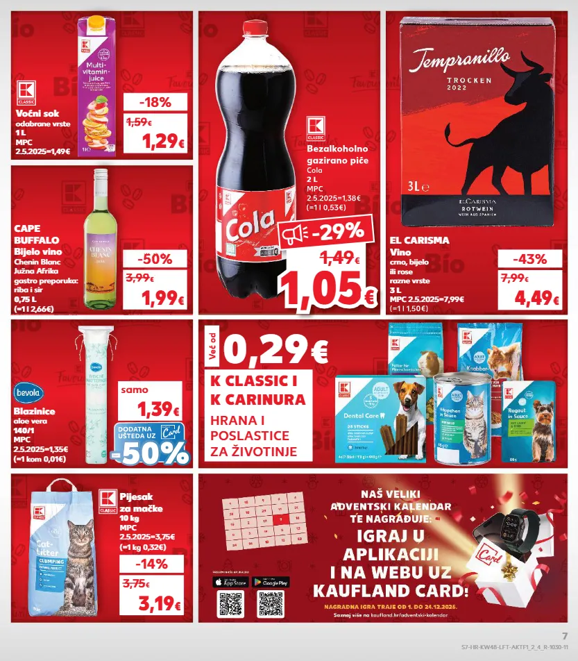 kratkotrajna ponuda samo ponuda kratkotrajna ponuda samo kratkotrajna ponuda - pijesak za mačke 10 kg mpc 2.5.2025=3,75€ (=1 kg 0,32€) cape buffalo bijelo vino chenin blanc južna afrika gastro preporuka: riba i sir 0,75 l (=1 l 2,66€) -14% 3,19 € 3,75 € kratkotrajna samo -50% 1,99 € 3,99 € (=1 l 1,50€) el carisma vino crno, bijelo ili rose razne vrste 3 l mpc 2.5.2025=7,99€ -43% 4,49 € 7,99 € bezalkoholno gazirano piće cola 2 l mpc 2.5.2025=1,38€ (=1 l 0,53€) samo -18% 1,29 € 1,59 € voćni sok odabrane vrste 1 l mpc 2.5.2025=1,49€ (=1 kom 0,01€) blazinice aloe vera 140/1 mpc 2.5.2025=1,35€ samo 1,39 € 50% dodatna ušteda uz (=1 l 1,50€) (=1 l 1,50€) bezalkoholno bezalkoholno gazirano piće cola 2 l mpc mpc 2.5.2025=1,38€ 2.5.2025=1,38€ 2.5.2025=1,38€ (=1 l 0,53€) (=1 l 0,53€) (=1 l 0,53€) 1,59 3,99 samo - 50% 50% dodatna ušteda uz - - - - dodatna ušteda uz 1,0 5 1,05 € € -29% 1,49 € 0,29 € hrana i poslastice za životinje k classic i k carinura već od s7-hr-kw48-lft-aktf1_2_4_r-1030-11 7