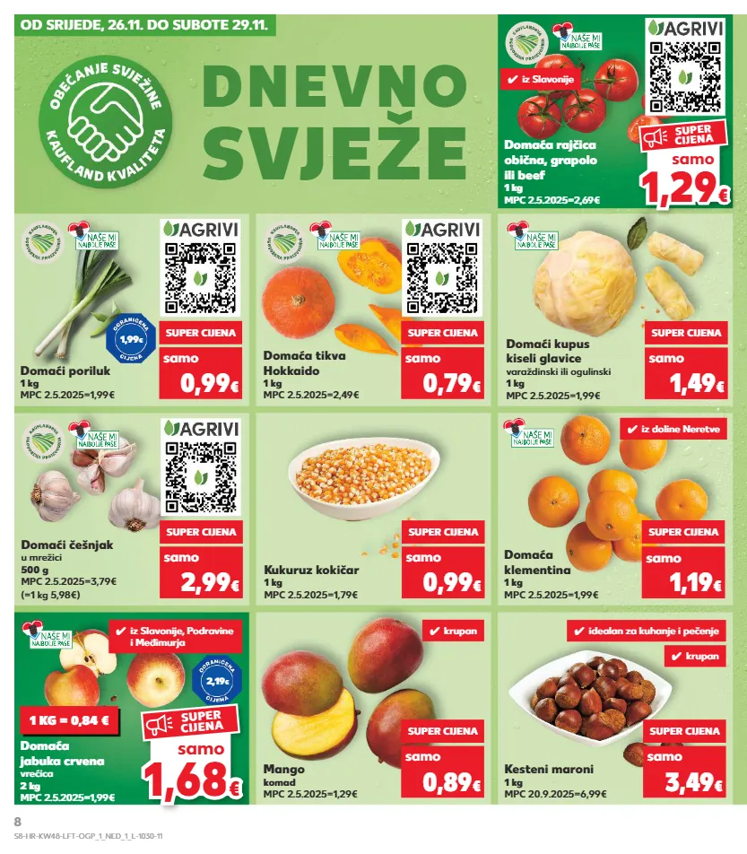 kratkotrajna ponuda kratkotrajna ponuda kratkotrajna ponuda kratkotrajna ponuda kratkotrajna ponuda kratkotrajna ponuda kratkotrajna ponuda kratkotrajna ponuda od srijede, 26.11. do subote 29.11. dnevno svježe domaća tikva hokkaido 1 kg mpc 2.5.2025=2,49€ domaći poriluk 1 kg mpc 2.5.2025=1,99€ domaći kupus kiseli glavice varaždinski ili ogulinski 1 kg mpc 2.5.2025=1,99€ domaći češnjak u mrežici 500 g mpc 2.5.2025=3,79€ (=1 kg 5,98€) kukuruz kokičar 1 kg mpc 2.5.2025=1,79€ domaća jabuka crvena vrećica 2 kg mpc 2.5.2025=1,99€ mango komad mpc 2.5.2025=1,29€ kesteni maroni 1 kg mpc 20.9.2025=6,99€ super cijena samo 0,99 € samo super cijena 0,79 € samo super cijena 1,49 € super cijena samo 2,99 € samo super cijena 0,99 € samo super cijena 0,89 € samo super cijena 3,49 € domaća rajčica obična, grapolo ili beef 1 kg mpc 2.5.2025=2,69€ samo super cijena 1,19 € domaća klementina 1 kg mpc 2.5.2025=1,99€ 1,99 € 2,19 € 1 kg = 0,84 € ✓ iz slavonije ✓ iz doline neretve ✓ iz slavonije, podravine i međimurja ✓ krupan ✓ krupan ✓ idealan za kuhanje i pečenje 1,68 1,68 € € samo super cijena 1,29 1,29 € € samo super cijena s8-hr-kw48-lft-ogp_1_ned_1_l-1030-11 8