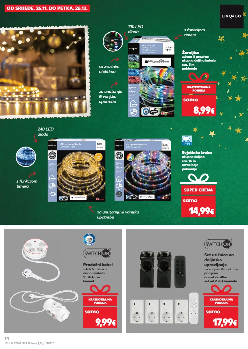 17,99 € samo kratkotrajna ponuda set utičnica na daljinsko upravljanje za vanjsku ili unutarnju primjenu domet do 40m set od 2 ili 4 komada 9,99 € samo kratkotrajna ponuda produžni kabel s 4 ili 6 utičnica dužina kabela 1,5 ili 4,5 m komad 240 led dioda s funkcijom timera za unutarnju ili vanjsku upotrebu svjetleća traka ukupna duljina cca. 15 m razne boje pakiranje 14,99 € samo super cijena 8,99 € samo kratkotrajna ponuda žaruljice zelene ili prozirne ukupna duljina kabela cca. 5 m pakiranje sa zvučnim efektima za unutarnju ili vanjsku upotrebu 100 led dioda s funkcijom timera od srijede, 26.11. do petka, 26.12. s14-hr-kw48-oc4-online4_1_14_r-1030-11 14