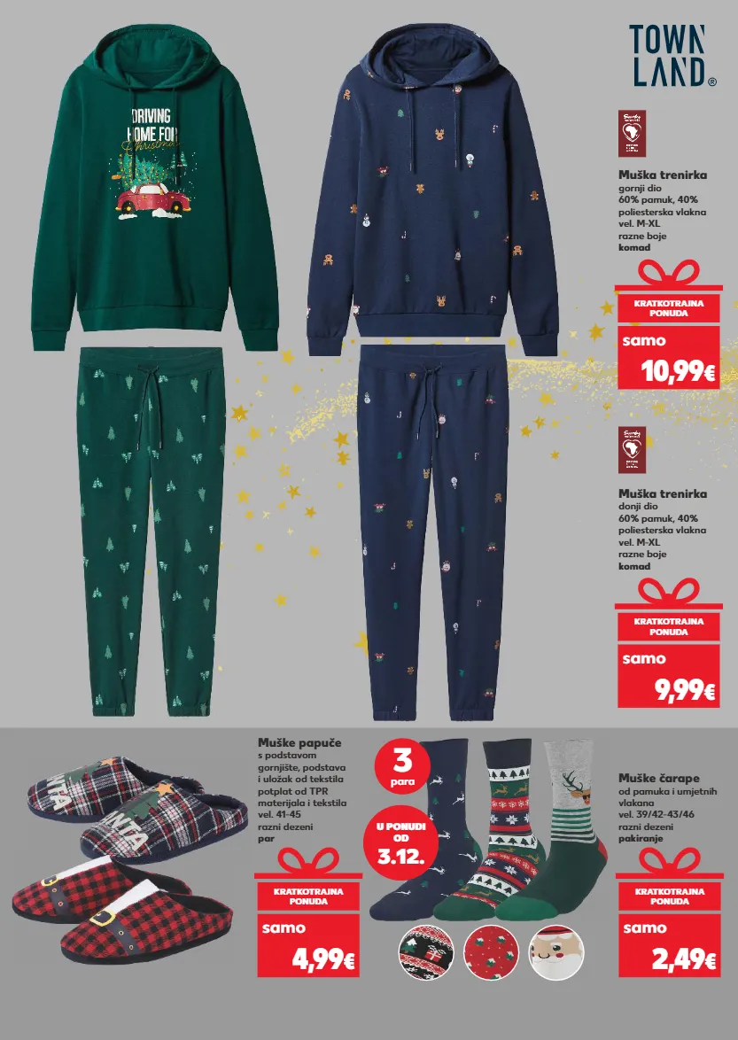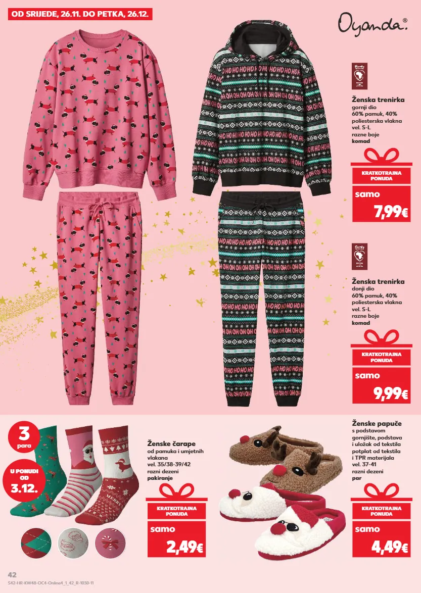7,99 € samo kratkotrajna ponuda ženska trenirka gornji dio 60% pamuk, 40% poliesterska vlakna vel. s-l razne boje komad 2,49 € samo kratkotrajna ponuda ženske čarape od pamuka i umjetnih vlakana vel. 35/38-39/42 razni dezeni pakiranje 3 para 4,49 € samo kratkotrajna ponuda ženske papuče s podstavom gornjište, podstava i uložak od tekstila potplat od tekstila i tpr materijala vel. 37-41 razni dezeni par 9,99 € samo kratkotrajna ponuda ženska trenirka donji dio 60% pamuk, 40% poliesterska vlakna vel. s-l razne boje komad u ponudi od 3.12. od srijede, 26.11. do petka, 26.12. s42-hr-kw48-oc4-online4_1_42_r-1030-11 42
