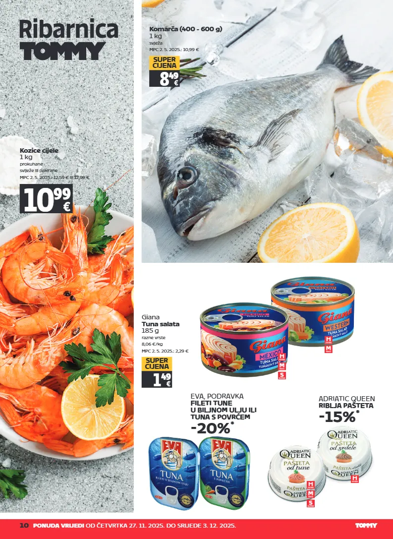10 ponuda vrijedi od četvrtka 27. 11. 2025. do srijede 3. 12. 2025. ribarnica giana tuna salata 185 g razne vrste 8,06 €/kg mpc 2. 5. 2025.: 2,29 € 1 49 super cijena eva, podravka fileti tune u biljnom ulju ili tuna s povrćem -20% * adriatic queen riblja pašteta -15% * komarča (400 - 600 g) 1 kg svježa mpc 2. 5. 2025.: 10,99 € 8 49 super cijena kozice cijele 1 kg prokuhane sviježe ili pakirane mpc 2. 5. 2025.: 12,59 € ili 12,99 € 10 99