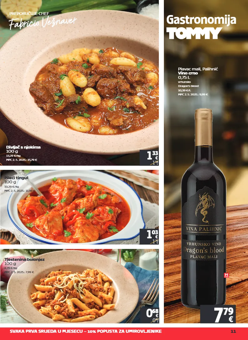 svaka prva srijeda u mjesecu – 10% popusta za umirovljenike 11 gastronomija plavac mali, palihnić vino crno 0,75 l vrhunsko dragon’s blood 10,39 €/l mpc 2. 5. 2025.: 9,99 € 7 79 divljač s njokima 100 g 13,29 €/kg mpc 2. 5. 2025.: 15,79 € preporučuje chef 1 33 1 58 pileći tingul 100 g 10,29 €/kg mpc 2. 5. 2025.: 11,99 € 0 68 0 80 tjestenina bolonjez 100 g 6,79 €/kg mpc 2. 5. 2025.: 7,99 € 1 03 1 20