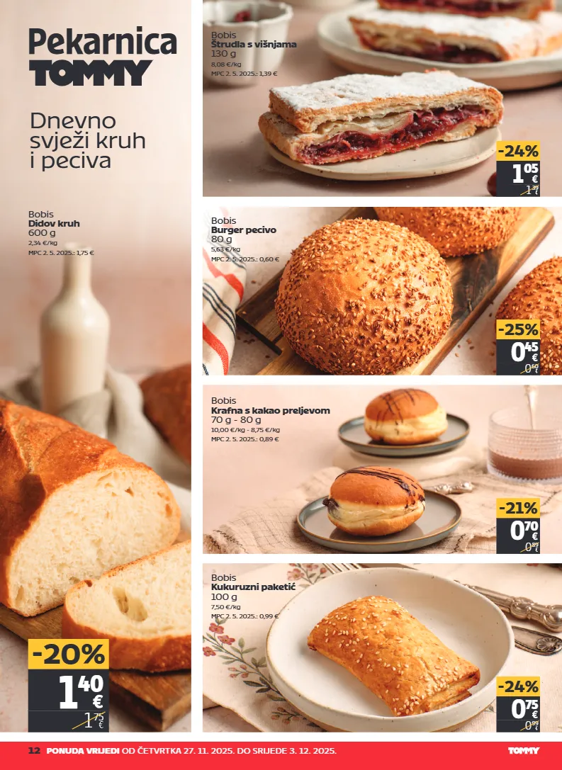 12 ponuda vrijedi od četvrtka 27. 11. 2025. do srijede 3. 12. 2025. pekarnica dnevno svježi kruh i peciva bobis didov kruh 600 g 2,34 €/kg mpc 2. 5. 2025.: 1,75 € 1 40 1 75 -20% bobis štrudla s višnjama 130 g 8,08 €/kg mpc 2. 5. 2025.: 1,39 € 1 05 1 39 -24% 0 45 0 60 -25% bobis burger pecivo 80 g 5,63 €/kg mpc 2. 5. 2025.: 0,60 € bobis krafna s kakao preljevom 70 g - 80 g 10,00 €/kg - 8,75 €/kg mpc 2. 5. 2025.: 0,89 € 0 70 0 89 -21% 0 75 0 99 -24% bobis kukuruzni paketić 100 g 7,50 €/kg mpc 2. 5. 2025.: 0,99 €