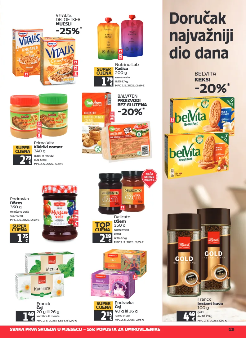svaka prva srijeda u mjesecu – 10% popusta za umirovljenike 13 vitalis, dr. oetker muesli -25% * nutrino lab kašica 200 g razne vrste 8,95 €/kg mpc 2. 5. 2025.: 2,49 € 1 79 super cijena podravka džem 360 g miješano voće 4,87 €/kg mpc 2. 5. 2025.: 2,49 € 1 75 super cijena delicato džem 350 g razne vrste extra 6,26 €/kg mpc 9. 9. 2025.: 2,85 € balviten proizvodi bez glutena -20% * franck instant kava 100 g gold 44,90 €/kg mpc 2. 5. 2025.: 5,99 € 4 49 franck čaj 20 g ili 26 g kamilica ili menta mpc 2. 5. 2025.: 1,85 € ili 1,99 € 1 49 doručak najvažniji dio dana podravka čaj 40 g ili 36 g razne vrste mpc 2. 5. 2025.: 2,95 € 2 15 super cijena prima vita kikiriki namaz 340 g glatki ili hrskavi 8,21 €/kg mpc 2. 5. 2025.: 4,29 € 2 79 super cijena 2 19 top cijena belvita keksi -20% *