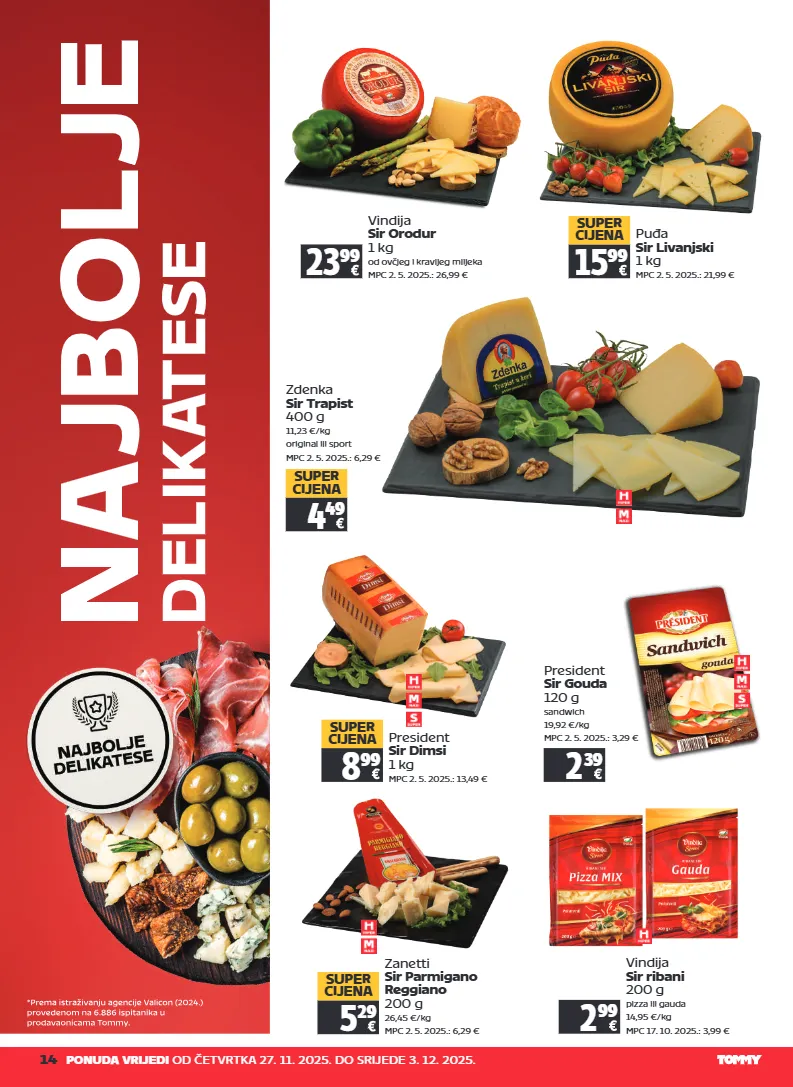 14 ponuda vrijedi od četvrtka 27. 11. 2025. do srijede 3. 12. 2025. vindija sir orodur 1 kg od ovčjeg i kravljeg mlijeka mpc 2. 5. 2025.: 26,99 € 23 99 puđa sir livanjski 1 kg mpc 2. 5. 2025.: 21,99 € 15 99 super cijena president sir gouda 120 g sandwich 19,92 €/kg mpc 2. 5. 2025.: 3,29 € 2 39 zanetti sir parmigano reggiano 200 g 26,45 €/kg mpc 2. 5. 2025.: 6,29 € 5 29 super cijena zdenka sir trapist 400 g 11,23 €/kg original ili sport mpc 2. 5. 2025.: 6,29 € 4 49 super cijena vindija sir ribani 200 g pizza ili gauda 14,95 €/kg mpc 17. 10. 2025.: 3,99 € 2 99 president sir dimsi 1 kg mpc 2. 5. 2025.: 13,49 € 8 99 super cijena