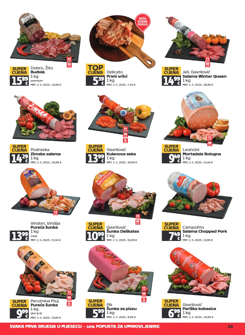 svaka prva srijeda u mjesecu – 10% popusta za umirovljenike 15 dobro, žito buđola 1 kg premium mpc 2. 5. 2025.: 23,99 € 15 89 super cijena jeli, gavrilović salama winter queen 1 kg mpc 2. 5. 2025.: 18,99 € 14 99 super cijena podravka zimska salama 1 kg mpc 2. 5. 2025.: 20,99 € 14 29 super cijena gavrilović kulenova seka 1 kg mpc 2. 5. 2025.: 19,99 € 13 99 super cijena vindon, vindija pureća šunka 1 kg royal mpc 2. 5. 2025.: 17,49 € 13 99 gavrilović šunka delikates 1 kg mpc 2. 5. 2025.: 15,99 € 10 99 super cijena leoncini mortadela bologna 1 kg mpc 2. 5. 2025.: 13,49 € 9 49 super cijena perutnina ptuj pureća šunka 1 kg slim & fit mpc 2. 5. 2025.: 13,99 € 9 99 super cijena campofrio salama chopped pork 1 kg mpc 2. 5. 2025.: 11,99 € 7 49 super cijena gavrilović pariška kobasica 1 kg mpc 2. 5. 2025.: 10,99 € 6 99 super cijena pik šunka za pizzu 1 kg mpc 2. 5. 2025.: 8,99 € 5 99 super cijena delicato prsni vršci 1 kg mpc 2. 5. 2025.: 7,29 € 5 39 top cijena