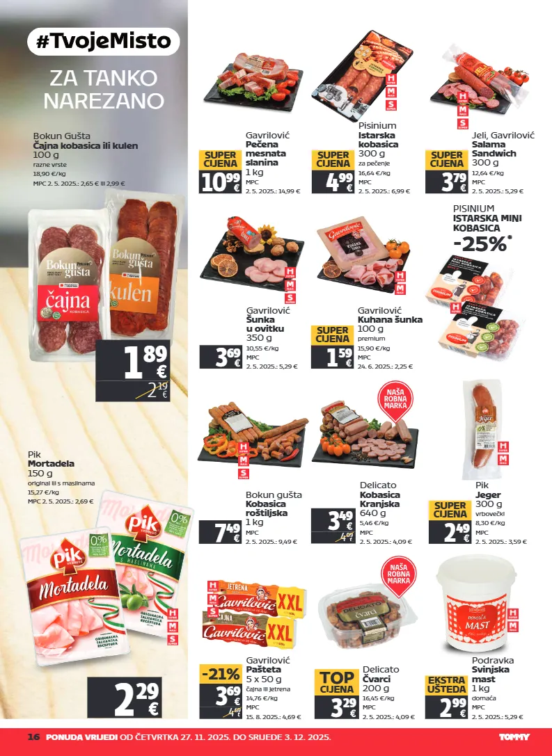 16 ponuda vrijedi od četvrtka 27. 11. 2025. do srijede 3. 12. 2025. za tanko narezano bokun gušta čajna kobasica ili kulen 100 g razne vrste 18,90 €/kg mpc 2. 5. 2025.: 2,65 € ili 2,99 € 2 29 pik mortadela 150 g original ili s maslinama 15,27 €/kg mpc 2. 5. 2025.: 2,69 € gavrilović pečena mesnata slanina 1 kg mpc 2. 5. 2025.: 14,99 € 10 99 super cijena bokun gušta kobasica roštiljska 1 kg mpc 2. 5. 2025.: 9,49 € 7 49 pik jeger 300 g vrbovečki 8,30 €/kg mpc 2. 5. 2025.: 3,59 € 2 49 super cijena pisinium istarska kobasica 300 g za pečenje 16,64 €/kg mpc 2. 5. 2025.: 6,99 € 4 99 super cijena gavrilović šunka u ovitku 350 g 10,55 €/kg mpc 2. 5. 2025.: 5,29 € 3 69 jeli, gavrilović salama sandwich 300 g 12,64 €/kg mpc 2. 5. 2025.: 5,29 € 3 79 super cijena pisinium istarska mini kobasica -25% * gavrilović kuhana šunka 100 g premium 15,90 €/kg mpc 24. 6. 2025.: 2,25 € 1 59 super cijena 3 49 4 09 delicato kobasica kranjska 640 g 5,46 €/kg mpc 2. 5. 2025.: 4,09 € 3 69 4 69 -21% gavrilović pašteta 5 x 50 g čajna ili jetrena 14,76 €/kg mpc 15. 8. 2025.: 4,69 € 3 29 top cijena delicato čvarci 200 g 16,45 €/kg mpc 2. 5. 2025.: 4,09 € podravka svinjska mast 1 kg domaća mpc 2. 5. 2025.: 5,29 € 2 99 ekstra ušteda 1 89 2 19