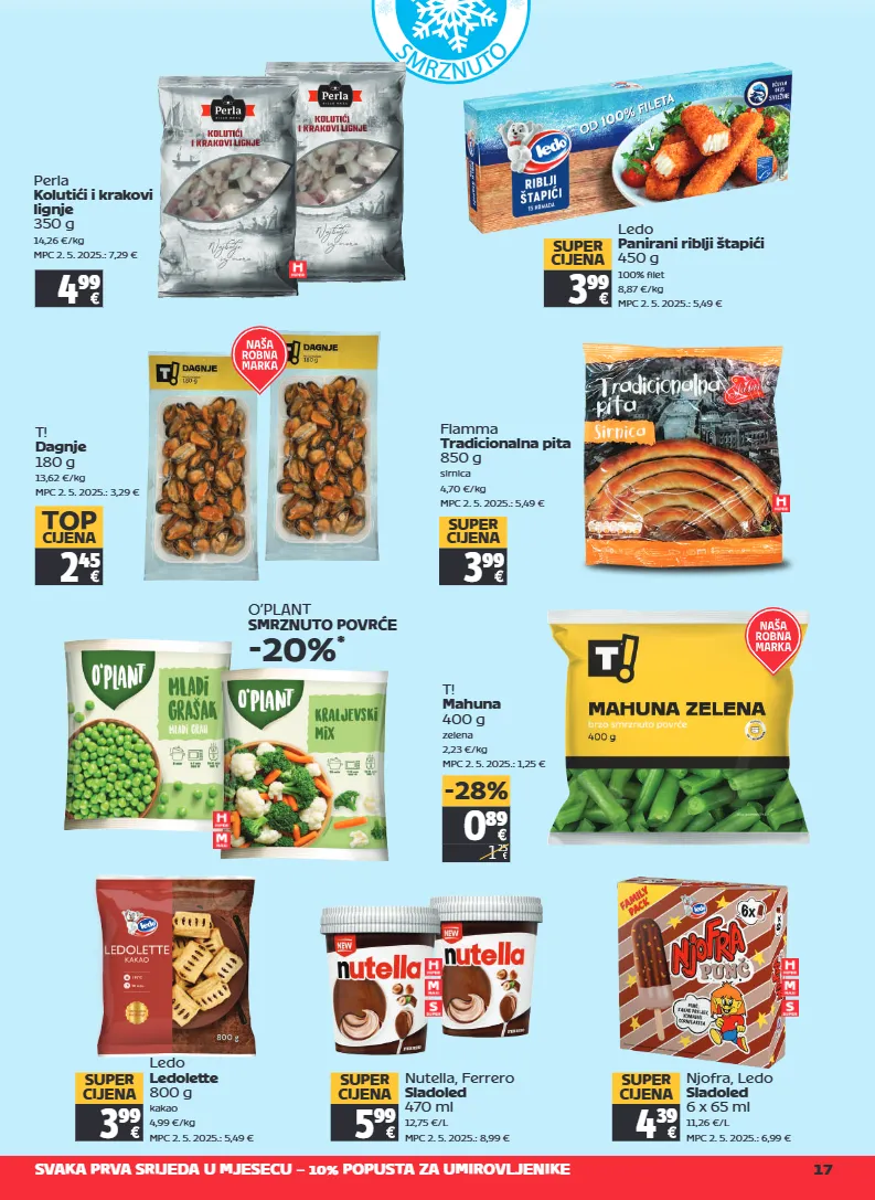 svaka prva srijeda u mjesecu – 10% popusta za umirovljenike 17 s m r z n u t o perla kolutići i krakovi lignje 350 g 14,26 €/kg mpc 2. 5. 2025.: 7,29 € 4 99 ledo panirani riblji štapići 450 g 100% filet 8,87 €/kg mpc 2. 5. 2025.: 5,49 € 3 99 super cijena t! dagnje 180 g 13,62 €/kg mpc 2. 5. 2025.: 3,29 € 2 45 top cijena flamma tradicionalna pita 850 g sirnica 4,70 €/kg mpc 2. 5. 2025.: 5,49 € 3 99 super cijena t! mahuna 400 g zelena 2,23 €/kg mpc 2. 5. 2025.: 1,25 € 0 89 1 25 -28% nutella, ferrero sladoled 470 ml 12,75 €/l mpc 2. 5. 2025.: 8,99 € 5 99 super cijena njofra, ledo sladoled 6 x 65 ml 11,26 €/l mpc 2. 5. 2025.: 6,99 € 4 39 super cijena ledo ledolette 800 g kakao 4,99 €/kg mpc 2. 5. 2025.: 5,49 € 3 99 super cijena o’plant smrznuto povrće -20% *