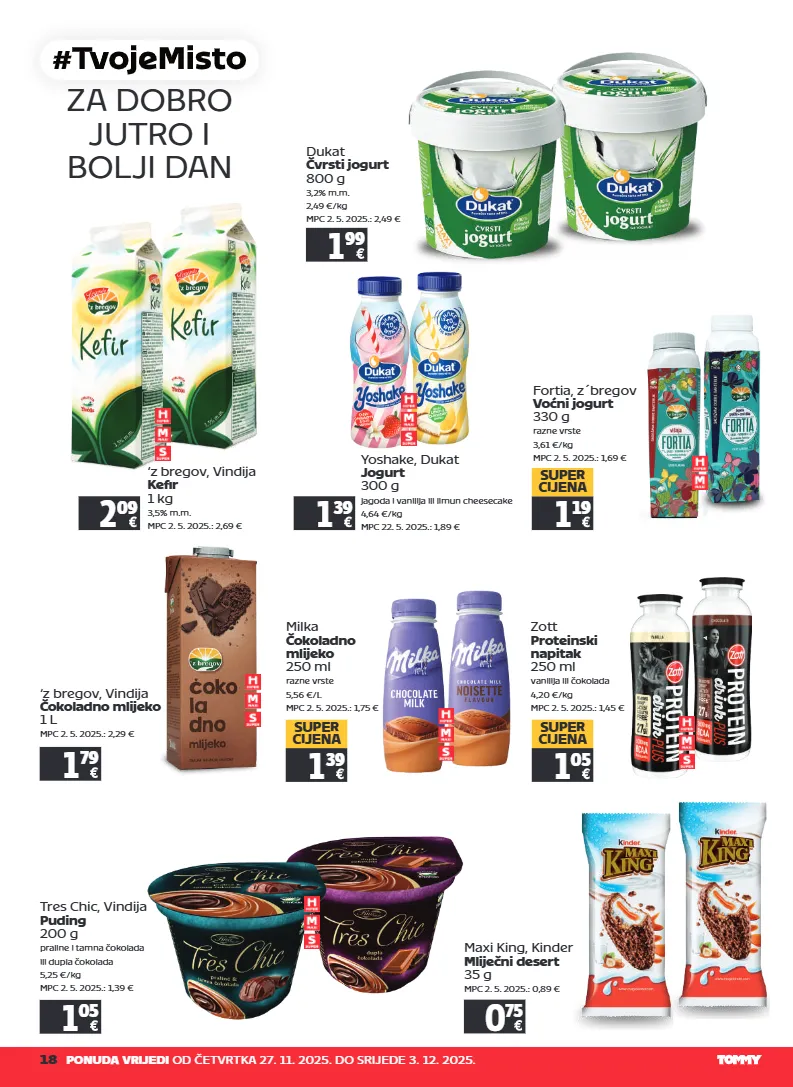 18 ponuda vrijedi od četvrtka 27. 11. 2025. do srijede 3. 12. 2025. za dobro jutro i bolji dan dukat čvrsti jogurt 800 g 3,2% m.m. 2,49 €/kg mpc 2. 5. 2025.: 2,49 € 1 99 ‘z bregov, vindija kefir 1 kg 3,5% m.m. mpc 2. 5. 2025.: 2,69 € 2 09 yoshake, dukat jogurt 300 g jagoda i vanilija ili limun cheesecake 4,64 €/kg mpc 22. 5. 2025.: 1,89 € 1 39 ‘z bregov, vindija čokoladno mlijeko 1 l mpc 2. 5. 2025.: 2,29 € 1 79 maxi king, kinder mliječni desert 35 g mpc 2. 5. 2025.: 0,89 € 0 75 fortia, z´bregov voćni jogurt 330 g razne vrste 3,61 €/kg mpc 2. 5. 2025.: 1,69 € 1 19 super cijena milka čokoladno mlijeko 250 ml razne vrste 5,56 €/l mpc 2. 5. 2025.: 1,75 € 1 39 super cijena zott proteinski napitak 250 ml vanilija ili čokolada 4,20 €/kg mpc 2. 5. 2025.: 1,45 € 1 05 super cijena tres chic, vindija puding 200 g praline i tamna čokolada ili dupla čokolada 5,25 €/kg mpc 2. 5. 2025.: 1,39 € 1 05