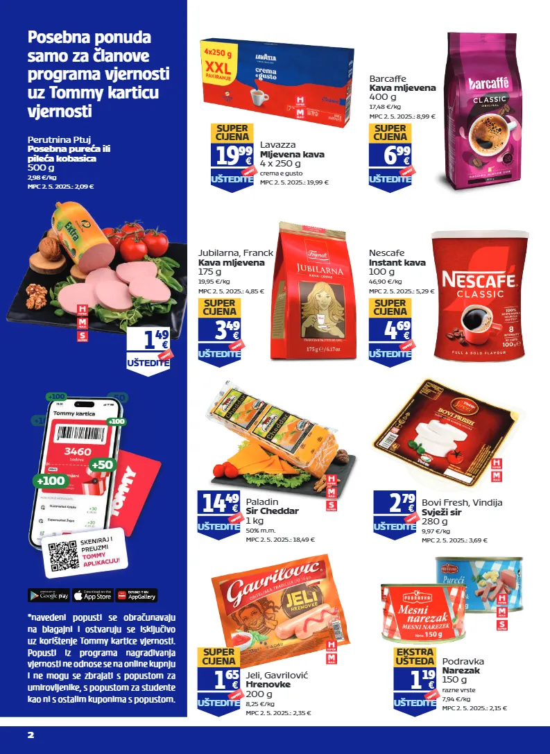 posebna ponuda samo za članove programa vjernosti uz tommy karticu vjernosti *navedeni popusti se obračunavaju na blagajni i ostvaruju se isključivo uz korištenje tommy kartice vjernosti. popusti iz programa nagrađivanja vjernosti ne odnose se na online kupnju i ne mogu se zbrajati s popustom za umirovljenike, s popustom za studente kao ni s ostalim kuponima s popustom. +50 +100 +100 +50 +100 +100 2 uštedite 1 49 nescafe instant kava 100 g 46,90 €/kg mpc 2. 5. 2025.: 5,29 € uštedite super cijena 4 69 barcaffe kava mljevena 400 g 17,48 €/kg mpc 2. 5. 2025.: 8,99 € uštedite super cijena 6 99 lavazza mljevena kava 4 x 250 g crema e gusto mpc 2. 5. 2025.: 19,99 € uštedite super cijena 19 99 jubilarna, franck kava mljevena 175 g 19,95 €/kg mpc 2. 5. 2025.: 4,85 € uštedite super cijena 3 49 perutnina ptuj posebna pureća ili pileća kobasica 500 g 2,98 €/kg mpc 2. 5. 2025.: 2,09 € paladin sir cheddar 1 kg 50% m.m. mpc 2. 5. 2025.: 18,49 € bovi fresh, vindija svježi sir 280 g 9,97 €/kg mpc 2. 5. 2025.: 3,69 € jeli, gavrilović hrenovke 200 g 8,25 €/kg mpc 2. 5. 2025.: 2,35 € podravka narezak 150 g razne vrste 7,94 €/kg mpc 2. 5. 2025.: 2,15 € uštedite 14 49 uštedite super cijena 1 65 uštedite ekstra ušteda 1 19 uštedite 2 79