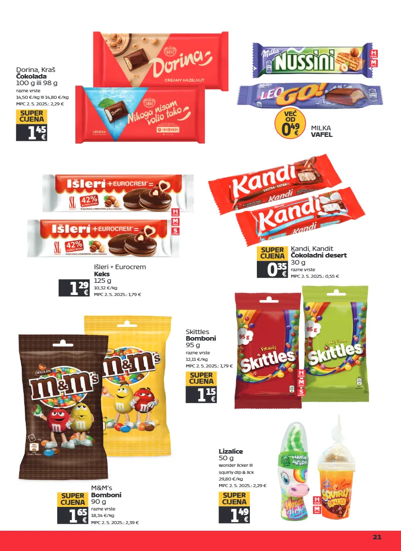 dorina, kraš čokolada 100 g ili 98 g razne vrste 14,50 €/kg ili 14,80 €/kg mpc 2. 5. 2025.: 2,29 € 1 45 super cijena milka vafel već od 0 49 m&m’s bomboni 90 g razne vrste 18,34 €/kg mpc 2. 5. 2025.: 2,39 € 1 65 super cijena 1 49 super cijena lizalice 50 g wonder licker ili squirly dip & lick 29,80 €/kg mpc 2. 5. 2025.: 2,29 € skittles bomboni 95 g razne vrste 12,11 €/kg mpc 2. 5. 2025.: 1,79 € 1 15 super cijena išleri + eurocrem keks 125 g 10,32 €/kg mpc 2. 5. 2025.: 1,79 € 1 29 kandi, kandit čokoladni desert 30 g razne vrste mpc 2. 5. 2025.: 0,55 € 0 35 super cijena 21