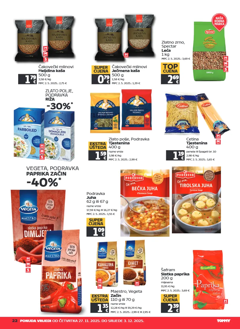 22 ponuda vrijedi od četvrtka 27. 11. 2025. do srijede 3. 12. 2025. zlatno zrno, spectar leća 1 kg mpc 2. 5. 2025.: 3,69 € 2 69 top cijena zlato polje, podravka riža -30% * zlato polje, podravka tjestenina 400 g razne vrste 3,98 €/kg mpc 2. 5. 2025.: 2,99 € 1 59 ekstra ušteda podravka juha 62 g ili 67 g razne vrste 17,59 €/kg ili 16,27 €/kg mpc 2. 5. 2025.: 1,55 € 1 09 super cijena vegeta, podravka paprika začin -40% * maestro, vegeta začin 110 g ili 70 g razne vrste 12,28 €/kg ili 19,29 €/kg mpc 2. 5. 2025.: 2,99 € ili 2,95 € 1 35 ekstra ušteda šafram slatka paprika 200 g mljevena 11,95 €/kg mpc 2. 5. 2025.: 3,69 € 2 39 super cijena čakovečki mlinovi ječmena kaša 500 g 1,58 €/kg mpc 2. 5. 2025.: 1,29 € 0 79 super cijena čakovečki mlinovi heljdina kaša 500 g 3,58 €/kg mpc 2. 5. 2025.: 2,75 € 1 79 cetina tjestenina 400 g penete ili špageti br. 10 2,98 €/kg mpc 2. 5. 2025.: 1,65 € 1 19