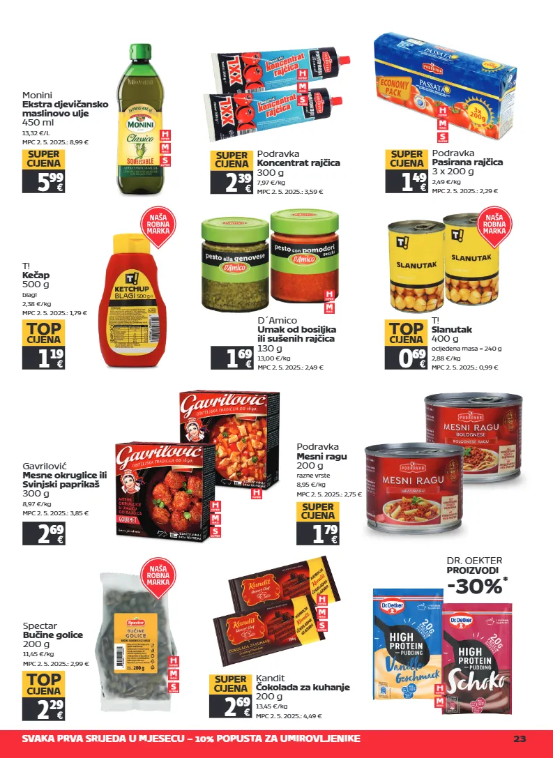 svaka prva srijeda u mjesecu – 10% popusta za umirovljenike 23 monini ekstra djevičansko maslinovo ulje 450 ml 13,32 €/l mpc 2. 5. 2025.: 8,99 € 5 99 super cijena podravka pasirana rajčica 3 x 200 g 2,49 €/kg mpc 2. 5. 2025.: 2,29 € 1 49 super cijena t! kečap 500 g blagi 2,38 €/kg mpc 2. 5. 2025.: 1,79 € 1 19 top cijena podravka mesni ragu 200 g razne vrste 8,95 €/kg mpc 2. 5. 2025.: 2,75 € 1 79 super cijena d´amico umak od bosiljka ili sušenih rajčica 130 g 13,00 €/kg mpc 2. 5. 2025.: 2,49 € 1 69 t! slanutak 400 g ocijeđena masa = 240 g 2,88 €/kg mpc 2. 5. 2025.: 0,99 € 0 69 top cijena podravka koncentrat rajčica 300 g 7,97 €/kg mpc 2. 5. 2025.: 3,59 € 2 39 super cijena dr. oekter proizvodi -30% * gavrilović mesne okruglice ili svinjski paprikaš 300 g 8,97 €/kg mpc 2. 5. 2025.: 3,85 € 2 69 kandit čokolada za kuhanje 200 g 13,45 €/kg mpc 2. 5. 2025.: 4,49 € 2 69 super cijena spectar bučine golice 200 g 11,45 €/kg mpc 2. 5. 2025.: 2,99 € 2 29 top cijena