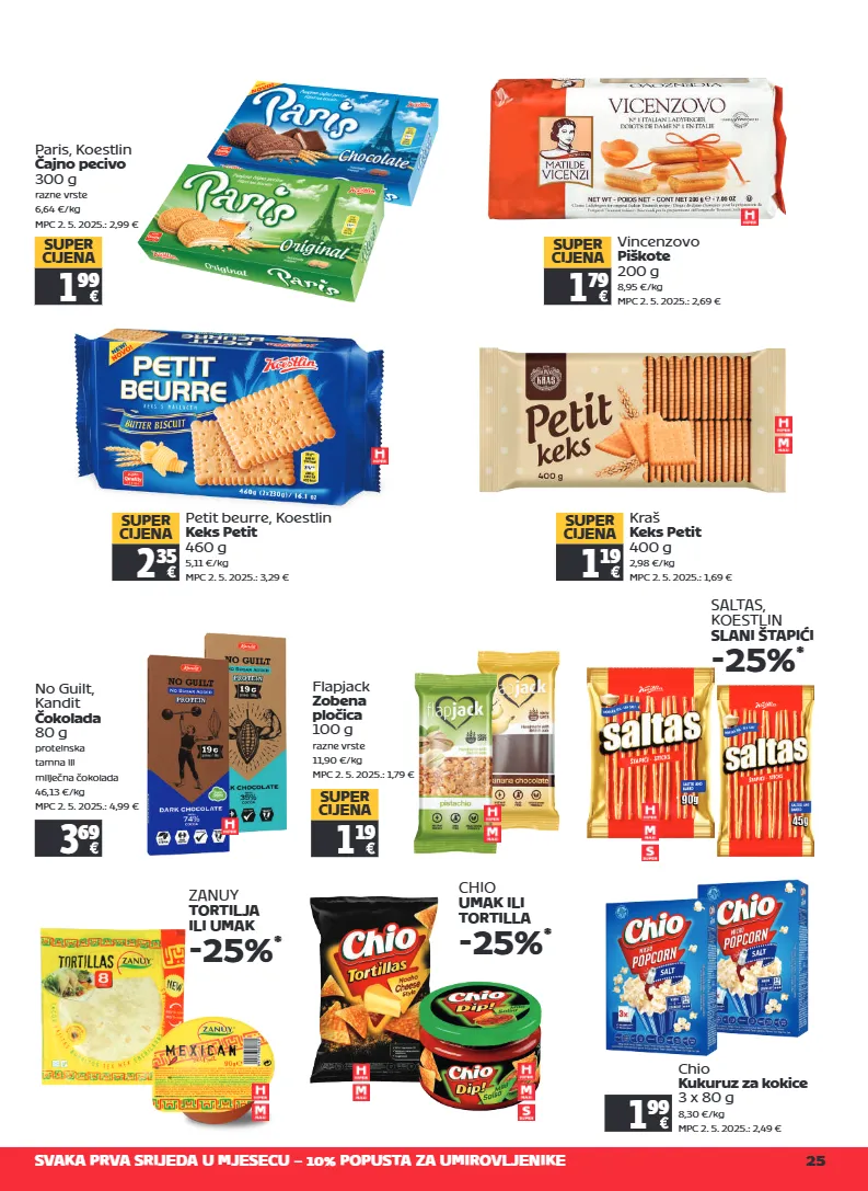 SVAKA PRVA SRIJEDA U MJESECU – 10% POPUSTA ZA UMIROVLJENIKE 25 Paris, Koestlin Čajno pecivo 300 g razne vrste 6,64 €/kg MPC 2. 5. 2025.: 2,99 € 1 99 SUPER CIJENA Petit beurre, Koestlin Keks Petit 460 g 5,11 €/kg MPC 2. 5. 2025.: 3,29 € 2 35 SUPER CIJENA SALTAS, KOESTLIN SLANI ŠTAPIĆI -25% * Kraš Keks Petit 400 g 2,98 €/kg MPC 2. 5. 2025.: 1,69 € 1 19 SUPER CIJENA Vincenzovo Piškote 200 g 8,95 €/kg MPC 2. 5. 2025.: 2,69 € 1 79 SUPER CIJENA Flapjack Zobena pločica 100 g razne vrste 11,90 €/kg MPC 2. 5. 2025.: 1,79 € 1 19 SUPER CIJENA No Guilt, Kandit Čokolada 80 g proteinska tamna ili mliječna čokolada 46,13 €/kg MPC 2. 5. 2025.: 4,99 € 3 69 Chio Kukuruz za kokice 3 x 80 g 8,30 €/kg MPC 2. 5. 2025.: 2,49 € 1 99 ZANUY TORTILJA ILI UMAK -25% * CHIO UMAK ILI TORTILLA -25% *