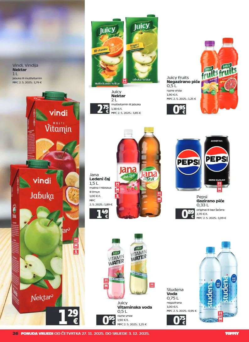 26 ponuda vrijedi od četvrtka 27. 11. 2025. do srijede 3. 12. 2025. vindi, vindija nektar 1 l jabuka ili multivitamin mpc 2. 5. 2025.: 1,79 € 1 29 juicy nektar 2 l multivitamin ili jabuka 1,38 €/l mpc 2. 5. 2025.: 3,85 € 2 75 juicy fruits negazirano piće 0,5 l razne vrste 1,90 €/l mpc 2. 5. 2025.: 1,25 € 0 95 jana ledeni čaj 1,5 l malina i hibiskus ili limun 1,00 €/l mpc 2. 5. 2025.: 1,89 € 1 49 pepsi gazirano piće 0,33 l original ili bez šećera 2,70 €/l mpc 2. 5. 2025.: 1,09 € 0 89 juicy vitaminska voda 0,5 l razne vrste 1,90 €/l mpc 2. 5. 2025.: 1,25 € 0 95 studena voda 0,75 l negazirana 1,00 €/l mpc 2. 5. 2025.: 0,95 € 0 75