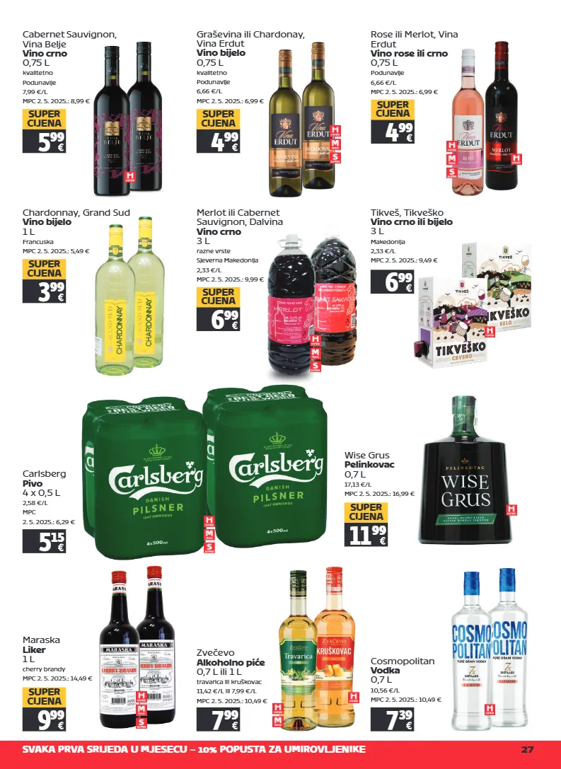 svaka prva srijeda u mjesecu – 10% popusta za umirovljenike 27 cabernet sauvignon, vina belje vino crno 0,75 l kvalitetno podunavlje 7,99 €/l mpc 2. 5. 2025.: 8,99 € 5 99 super cijena graševina ili chardonay, vina erdut vino bijelo 0,75 l kvalitetno podunavlje 6,66 €/l mpc 2. 5. 2025.: 6,99 € 4 99 super cijena rose ili merlot, vina erdut vino rose ili crno 0,75 l podunavlje 6,66 €/l mpc 2. 5. 2025.: 6,99 € 4 99 super cijena chardonnay, grand sud vino bijelo 1 l francuska mpc 2. 5. 2025.: 5,49 € 3 99 super cijena merlot ili cabernet sauvignon, dalvina vino crno 3 l razne vrste sjeverna makedonija 2,33 €/l mpc 2. 5. 2025.: 9,99 € 6 99 super cijena tikveš, tikveško vino crno ili bijelo 3 l makedonija 2,33 €/l mpc 2. 5. 2025.: 9,49 € 6 99 carlsberg pivo 4 x 0,5 l 2,58 €/l mpc 2. 5. 2025.: 6,29 € 5 15 wise grus pelinkovac 0,7 l 17,13 €/l mpc 2. 5. 2025.: 16,99 € 11 99 super cijena maraska liker 1 l cherry brandy mpc 2. 5. 2025.: 14,49 € 9 99 super cijena zvečevo alkoholno piće 0,7 l ili 1 l travarica ili kruškovac 11,42 €/l ili 7,99 €/l mpc 2. 5. 2025.: 10,49 € 7 99 cosmopolitan vodka 0,7 l 10,56 €/l mpc 2. 5. 2025.: 10,49 € 7 39