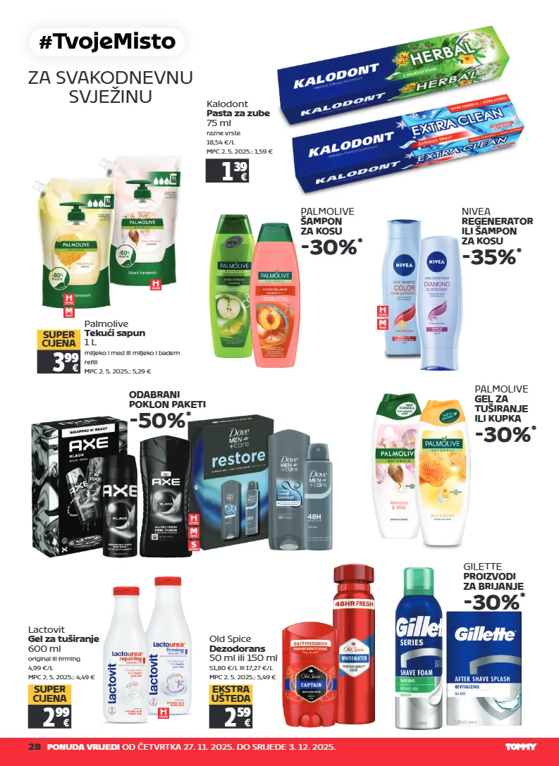 28 ponuda vrijedi od četvrtka 27. 11. 2025. do srijede 3. 12. 2025. kalodont pasta za zube 75 ml razne vrste 18,54 €/l mpc 2. 5. 2025.: 1,59 € 1 39 za svakodnevnu svježinu palmolive tekući sapun 1 l mlijeko i med ili mlijeko i badem refill mpc 2. 5. 2025.: 5,29 € 3 99 super cijena nivea regenerator ili šampon za kosu -35% * palmolive šampon za kosu -30% * lactovit gel za tuširanje 600 ml original ili firming 4,99 €/l mpc 2. 5. 2025.: 4,49 € old spice dezodorans 50 ml ili 150 ml 51,80 €/l ili 17,27 €/l mpc 2. 5. 2025.: 5,49 € 2 99 super cijena 2 59 ekstra ušteda palmolive gel za tuširanje ili kupka -30% * gilette proizvodi za brijanje -30% * odabrani poklon paketi -50% *