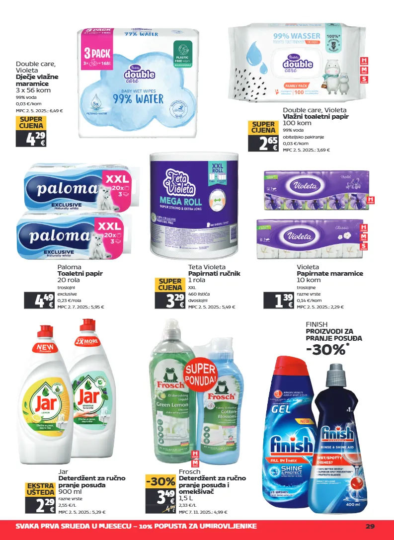 svaka prva srijeda u mjesecu – 10% popusta za umirovljenike 29 double care, violeta dječje vlažne maramice 3 x 56 kom 99% voda 0,03 €/kom mpc 2. 5. 2025.: 6,49 € 4 29 super cijena double care, violeta vlažni toaletni papir 100 kom 99% voda obiteljsko pakiranje 0,03 €/kom mpc 2. 5. 2025.: 3,69 € 2 65 super cijena paloma toaletni papir 20 rola troslojni exclusive 0,23 €/rola mpc 2. 7. 2025.: 5,95 € 4 49 teta violeta papirnati ručnik 1 rola xxl 460 listića dvoslojni mpc 2. 5. 2025.: 5,49 € 3 29 super cijena violeta papirnate maramice 10 kom troslojne razne vrste 0,14 €/kom mpc 2. 5. 2025.: 2,29 € 1 39 jar deterdžent za ručno pranje posuđa 900 ml razne vrste 2,55 €/l mpc 2. 5. 2025.: 5,29 € 2 29 ekstra ušteda 3 49 4 99 -30% frosch deterdžent za ručno pranje posuđa i omekšivač 1,5 l 2,33 €/l mpc 7. 11. 2025.: 4,99 € finish proizvodi za pranje posuđa -30% *