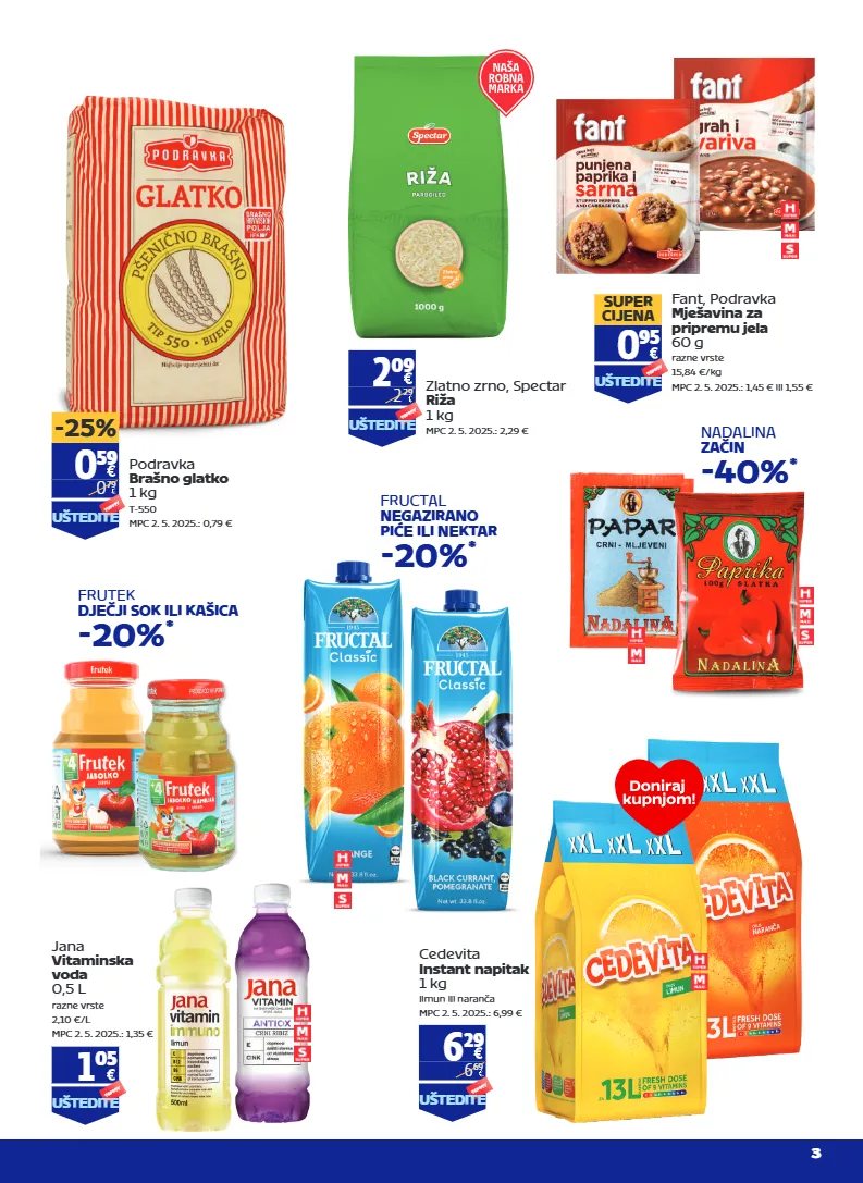 3 0 79 uštedite 0 59 -25% podravka brašno glatko 1 kg t-550 mpc 2. 5. 2025.: 0,79 € fant, podravka mješavina za pripremu jela 60 g razne vrste 15,84 €/kg mpc 2. 5. 2025.: 1,45 € ili 1,55 € uštedite super cijena 0 95 nadalina začin -40% * frutek dječji sok ili kašica -20% * fructal negazirano piće ili nektar -20% * jana vitaminska voda 0,5 l razne vrste 2,10 €/l mpc 2. 5. 2025.: 1,35 € uštedite 1 05 cedevita instant napitak 1 kg limun ili naranča mpc 2. 5. 2025.: 6,99 € 6 69 uštedite 6 29 2 29 uštedite 2 09 zlatno zrno, spectar riža 1 kg mpc 2. 5. 2025.: 2,29 €