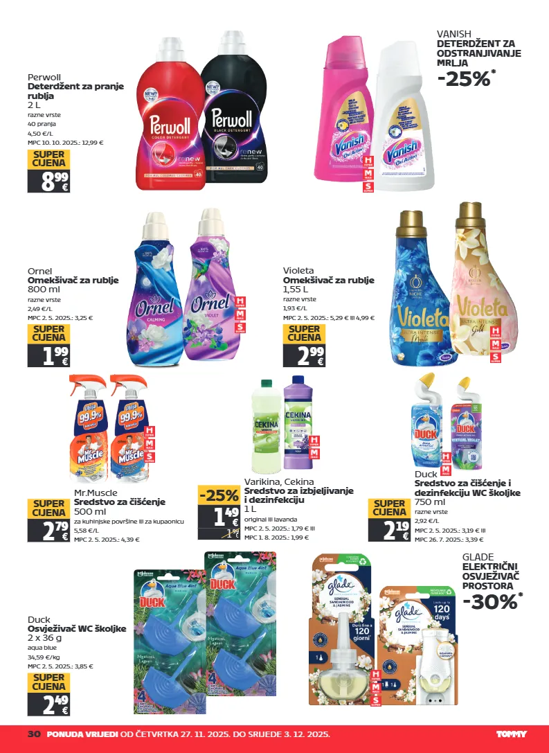 30 ponuda vrijedi od četvrtka 27. 11. 2025. do srijede 3. 12. 2025. perwoll deterdžent za pranje rublja 2 l razne vrste 40 pranja 4,50 €/l mpc 10. 10. 2025.: 12,99 € 8 99 super cijena vanish deterdžent za odstranjivanje mrlja -25% * ornel omekšivač za rublje 800 ml razne vrste 2,49 €/l mpc 2. 5. 2025.: 3,25 € 1 99 super cijena violeta omekšivač za rublje 1,55 l razne vrste 1,93 €/l mpc 2. 5. 2025.: 5,29 € ili 4,99 € 2 99 super cijena mr.muscle sredstvo za čišćenje 500 ml za kuhinjske površine ili za kupaonicu 5,58 €/l mpc 2. 5. 2025.: 4,39 € 2 79 super cijena 1 49 1 99 -25% varikina, cekina sredstvo za izbjeljivanje i dezinfekciju 1 l original ili lavanda mpc 2. 5. 2025.: 1,79 € ili mpc 1. 8. 2025.: 1,99 € duck sredstvo za čišćenje i dezinfekciju wc školjke 750 ml razne vrste 2,92 €/l mpc 2. 5. 2025.: 3,19 € ili mpc 26. 7. 2025.: 3,39 € 2 19 super cijena duck osvježivač wc školjke 2 x 36 g aqua blue 34,59 €/kg mpc 2. 5. 2025.: 3,85 € 2 49 super cijena glade električni osvježivač prostora -30% *