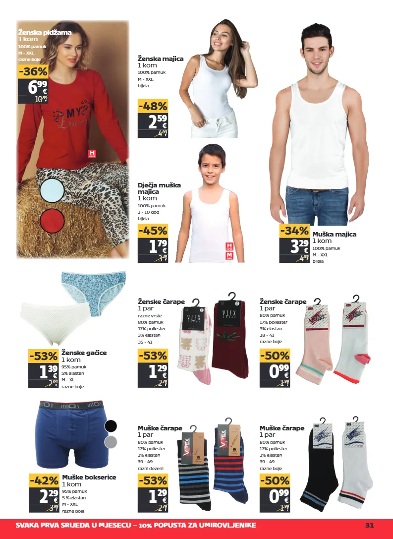 svaka prva srijeda u mjesecu – 10% popusta za umirovljenike 31 dječja muška majica 1 kom 100% pamuk 3 - 10 god bijela ženska majica 1 kom 100% pamuk m - xxl bijela ženske čarape 1 par razne vrste 80% pamuk 17% poliester 3% elastan 35 - 41 ženske čarape 1 par 80% pamuk 17% poliester 3% elastan 38 - 41 razne boje muška majica 1 kom 100% pamuk m - xxl bijela muške čarape 1 par 80% pamuk 17% poliester 3% elastan 39 - 49 razni dezeni 1 79 3 29 -45% 2 59 4 99 -48% 1 29 2 79 -53% 0 99 1 99 -50% 3 29 4 99 -34% 1 29 2 79 -53% 6 99 10 99 -36% ženska pidžama 1 kom 100% pamuk m - xxl razne boje ženske gaćice 1 kom 95% pamuk 5% elastan m - xl razne boje 1 39 2 99 -53% muške čarape 1 par 80% pamuk 17% poliester 3% elastan 39 - 49 razne boje muške bokserice 1 kom 95% pamuk 5 % elastan m - xxl razne boje 2 29 3 99 -42% 0 99 1 99 -50%