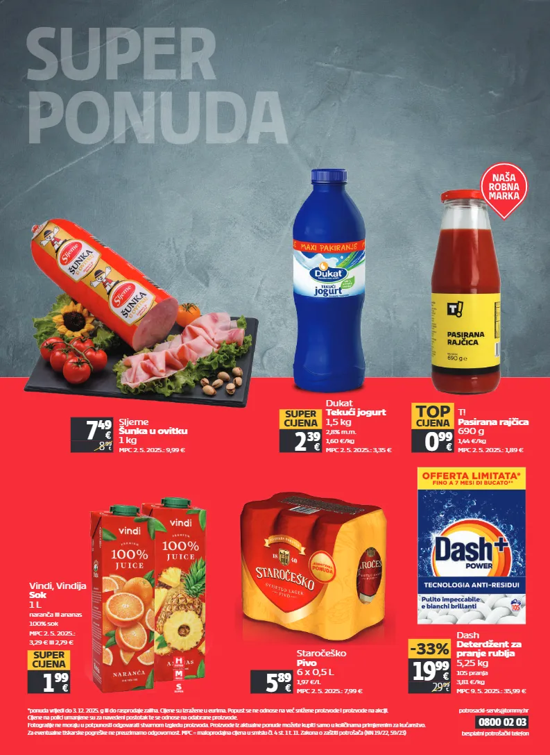 32 ponuda vrijedi od četvrtka 27. 11. 2025. do srijede 3. 12. 2025. 7 49 8 99 19 99 29 99 -33% super ponuda 0800 02 03 *ponuda vrijedi do 3. 12. 2025. g ili do rasprodaje zaliha. cijene su izražene u eurima. popust se ne odnose na već snižene proizvode i proizvode na akciji. cijene na polici umanjene su za navedeni postotak te se odnose na odabrane proizvode. fotografije ne moraju u potpunosti odgovarati stvarnom izgledu proizvoda. proizvode iz aktualne ponude možete kupiti samo u količinama primjerenim za kućanstvo. za eventualne tiskarske pogreške ne preuzimamo odgovornost. mpc = maloprodajna cijena u smislu čl. 4 st. 1 t. 11. zakona o zaštiti potrošača (nn 19/22, 59/23) besplatni potrošački telefon potrosacki-servis@tommy.hr sljeme šunka u ovitku 1 kg mpc 2. 5. 2025.: 9,99 € dukat tekući jogurt 1,5 kg 2,8% m.m. 1,60 €/kg mpc 2. 5. 2025.: 3,35 € 2 39 super cijena t! pasirana rajčica 690 g 1,44 €/kg mpc 2. 5. 2025.: 1,89 € 0 99 top cijena vindi, vindija sok 1 l naranča ili ananas 100% sok mpc 2. 5. 2025.: 3,29 € ili 2,79 € 1 99 super cijena staročeško pivo 6 x 0,5 l 1,97 €/l mpc 2. 5. 2025.: 7,99 € 5 89 dash deterdžent za pranje rublja 5,25 kg 105 pranja 3,81 €/kg mpc 9. 5. 2025.: 35,99 €