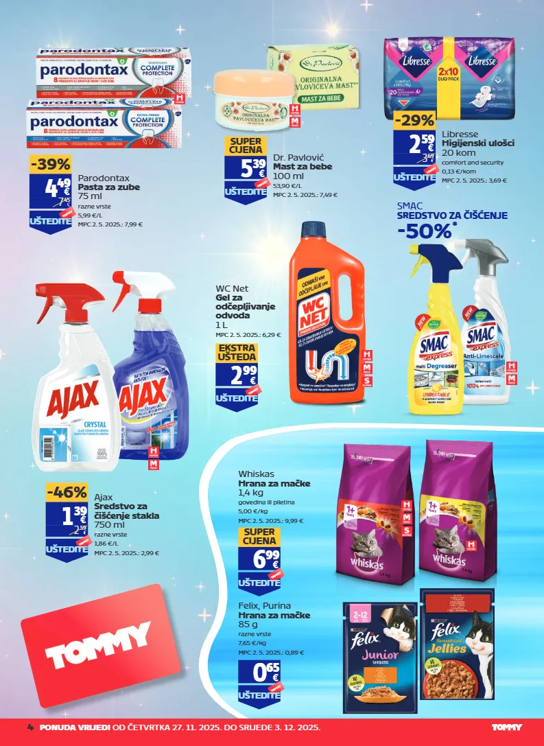 4 ponuda vrijedi od četvrtka 27. 11. 2025. do srijede 3. 12. 2025. felix, purina hrana za mačke 85 g razne vrste 7,65 €/kg mpc 2. 5. 2025.: 0,89 € 3 69 uštedite 2 59 -29% libresse higijenski ulošci 20 kom comfort and security 0,13 €/kom mpc 2. 5. 2025.: 3,69 € smac sredstvo za čišćenje -50% * whiskas hrana za mačke 1,4 kg govedina ili piletina 5,00 €/kg mpc 2. 5. 2025.: 9,99 € uštedite super cijena 6 99 uštedite 0 65 wc net gel za odčepljivanje odvoda 1 l mpc 2. 5. 2025.: 6,29 € uštedite ekstra ušteda 2 99 2 59 uštedite 1 39 -46% ajax sredstvo za čišćenje stakla 750 ml razne vrste 1,86 €/l mpc 2. 5. 2025.: 2,99 € dr. pavlović mast za bebe 100 ml 53,90 €/l mpc 2. 5. 2025.: 7,49 € uštedite super cijena 5 39 7 45 uštedite 4 49 -39% parodontax pasta za zube 75 ml razne vrste 5,99 €/l mpc 2. 5. 2025.: 7,99 €