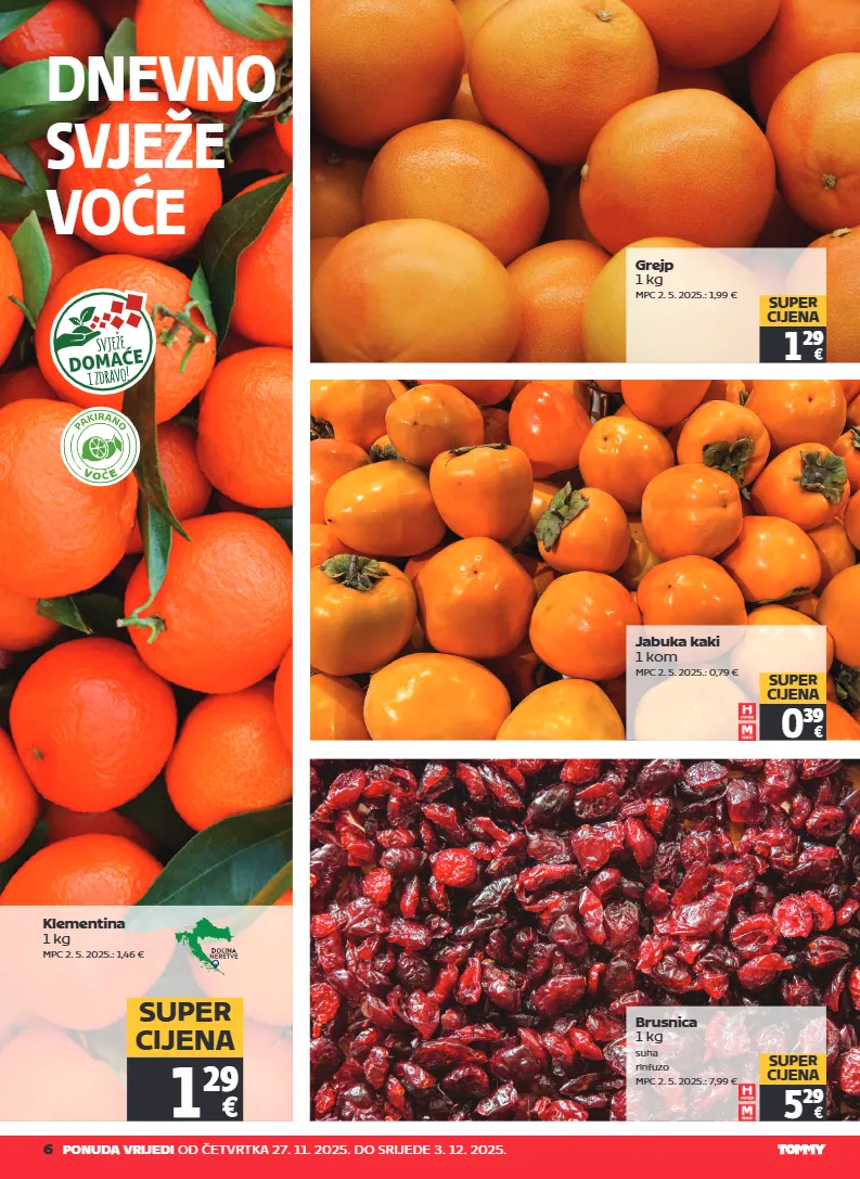 6 ponuda vrijedi od četvrtka 27. 11. 2025. do srijede 3. 12. 2025. dnevno svježe voće klementina 1 kg mpc 2. 5. 2025.: 1,46 € 1 29 super cijena brusnica 1 kg suha rinfuzo mpc 2. 5. 2025.: 7,99 € 5 29 super cijena grejp 1 kg mpc 2. 5. 2025.: 1,99 € 1 29 super cijena jabuka kaki 1 kom mpc 2. 5. 2025.: 0,79 € 0 39 super cijena v o e