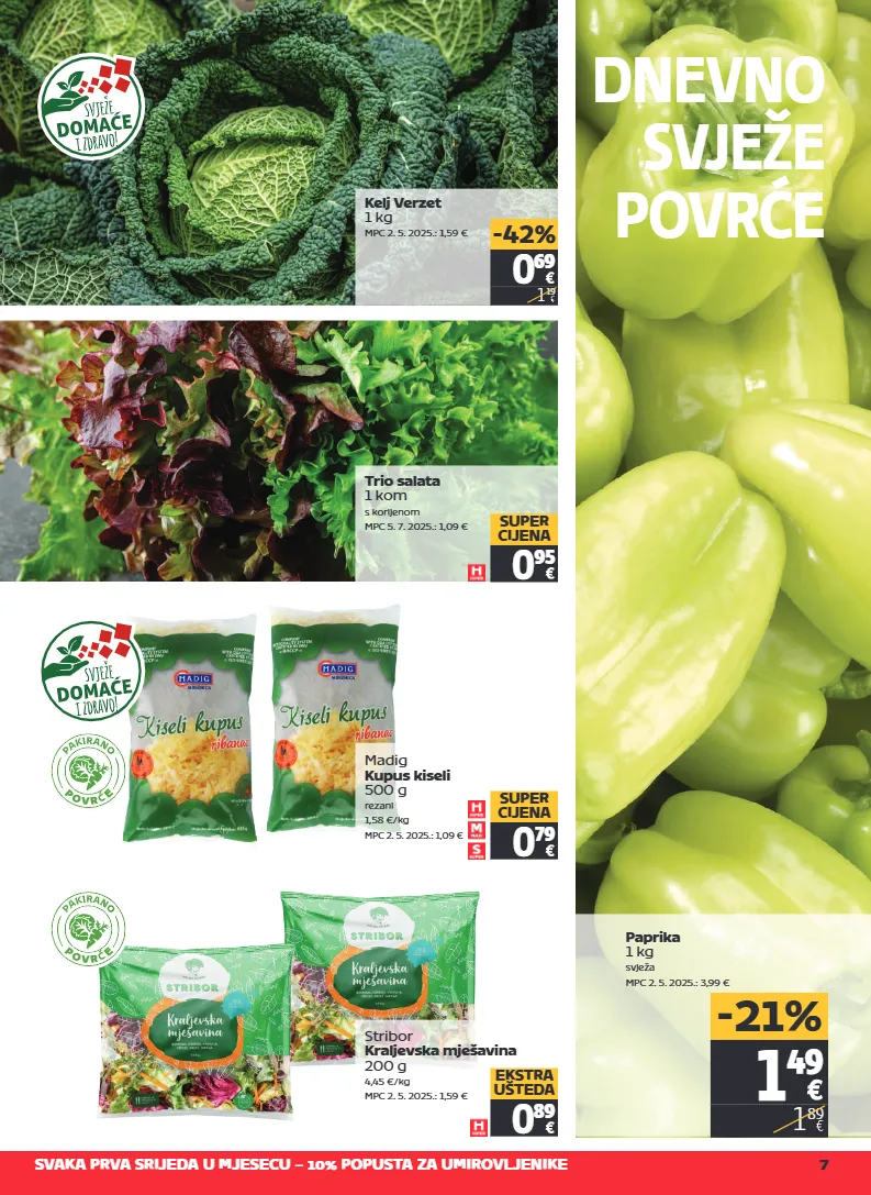 svaka prva srijeda u mjesecu – 10% popusta za umirovljenike 7 dnevno svježe povrće 1 49 1 89 -21% paprika 1 kg svježa mpc 2. 5. 2025.: 3,99 € kelj verzet 1 kg mpc 2. 5. 2025.: 1,59 € 0 69 1 19 -42% trio salata 1 kom s korijenom mpc 5. 7. 2025.: 1,09 € 0 95 super cijena madig kupus kiseli 500 g rezani 1,58 €/kg mpc 2. 5. 2025.: 1,09 € 0 79 super cijena stribor kraljevska mješavina 200 g 4,45 €/kg mpc 2. 5. 2025.: 1,59 € 0 89 ekstra ušteda p o v r e p o v r e