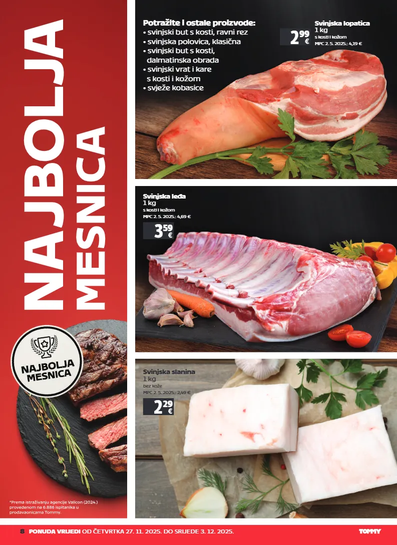 8 ponuda vrijedi od četvrtka 27. 11. 2025. do srijede 3. 12. 2025. svinjska leđa 1 kg s kosti i kožom mpc 2. 5. 2025.: 4,69 € 3 59 svinjska slanina 1 kg bez kože mpc 2. 5. 2025.: 2,49 € 2 29 svinjska lopatica 1 kg s kosti i kožom mpc 2. 5. 2025.: 4,19 € 2 99 potražite i ostale proizvode: • svinjski but s kosti, ravni rez • svinjska polovica, klasična • svinjski but s kosti, dalmatinska obrada • svinjski vrat i kare s kosti i kožom • svježe kobasice
