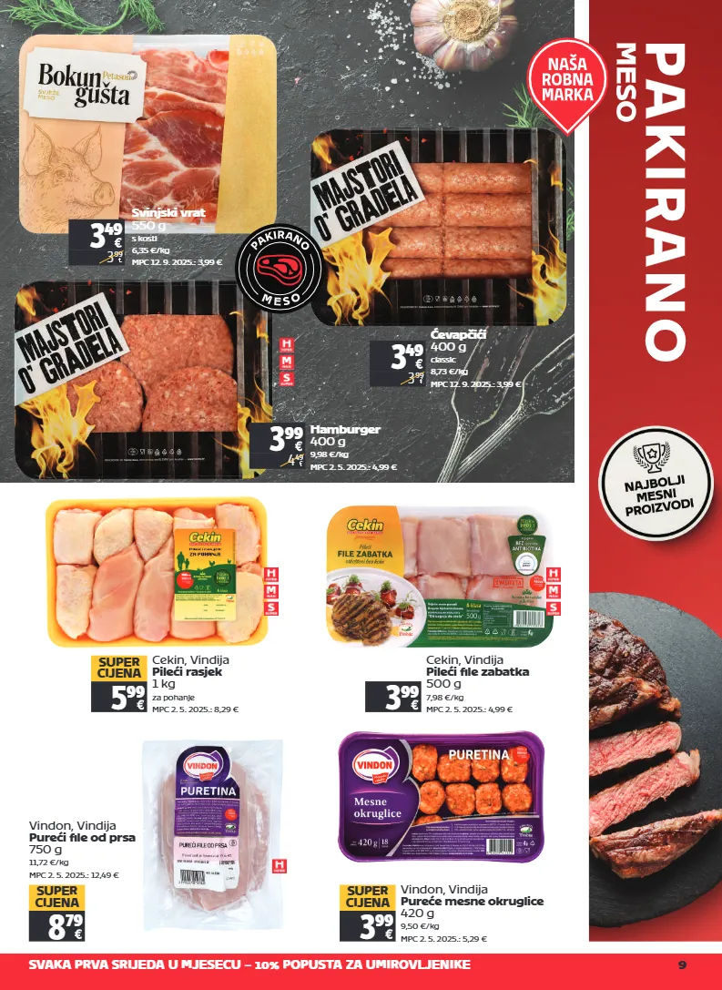 svaka prva srijeda u mjesecu – 10% popusta za umirovljenike 9 svinjski vrat 550 g s kosti 6,35 €/kg mpc 12. 9. 2025.: 3,99 € hamburger 400 g 9,98 €/kg mpc 2. 5. 2025.: 4,99 € ćevapčići 400 g classic 8,73 €/kg mpc 12. 9. 2025.: 3,99 € 3 49 3 99 3 99 4 49 3 49 3 99 cekin, vindija pileći rasjek 1 kg za pohanje mpc 2. 5. 2025.: 8,29 € 5 99 super cijena cekin, vindija pileći file zabatka 500 g 7,98 €/kg mpc 2. 5. 2025.: 4,99 € 3 99 vindon, vindija pureće mesne okruglice 420 g 9,50 €/kg mpc 2. 5. 2025.: 5,29 € 3 99 super cijena vindon, vindija pureći file od prsa 750 g 11,72 €/kg mpc 2. 5. 2025.: 12,49 € 8 79 super cijena